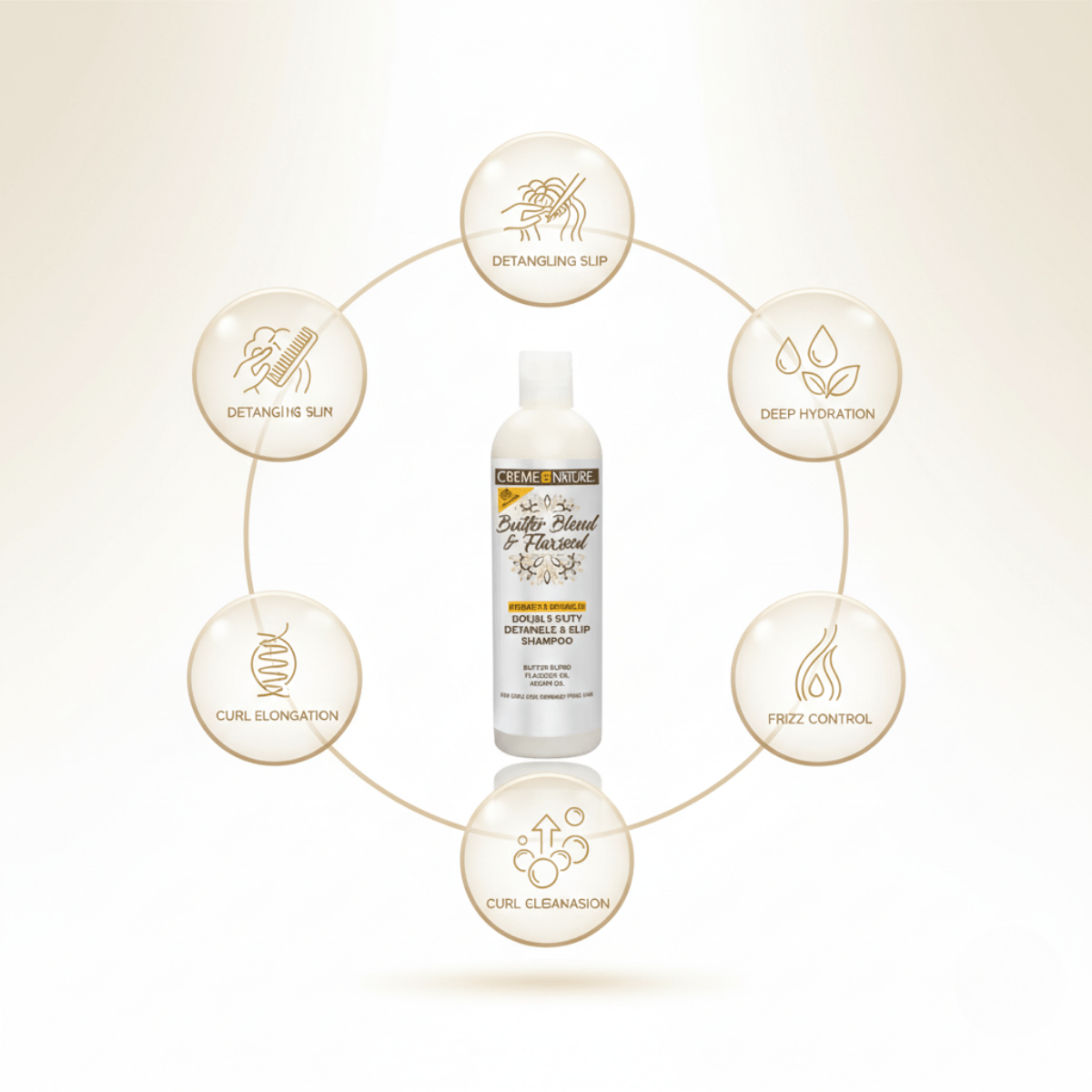 Das Creme of Nature Double Duty Detangle & Slip Shampoo wurde speziell für krauses, lockiges, trockenes und schrumpfanfälliges Haar entwickelt, das eine stärkende, feuchtigkeitsspendende und gleitende Reinigung braucht.