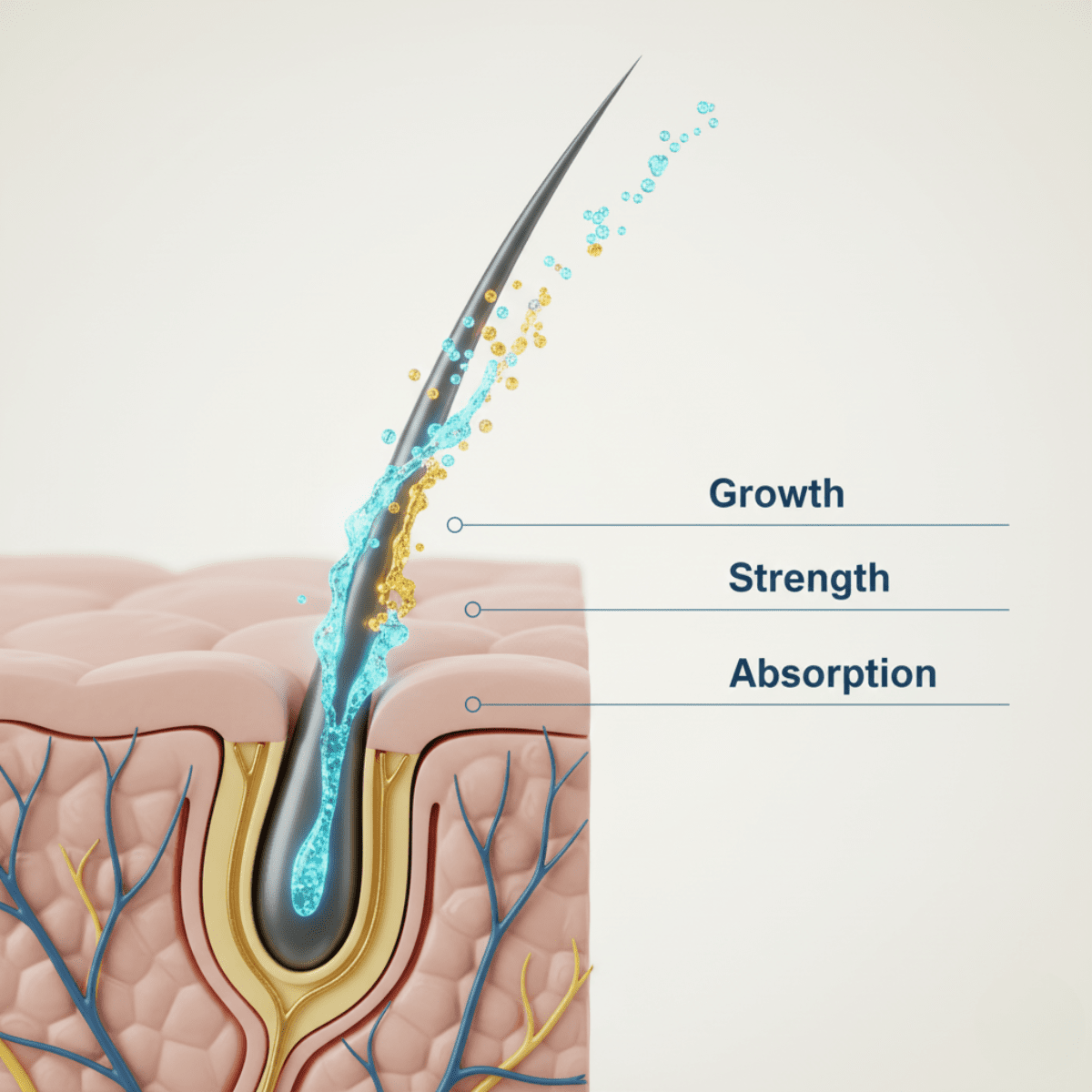 Das Time-Release-Liquid absorbiert extrem schnell, fördert eine gesunde Kopfhaut, reduziert Haarausfall und liefert deinem Körper täglich die Nährstoffe, die er für optimales Haarwachstum benötigt.