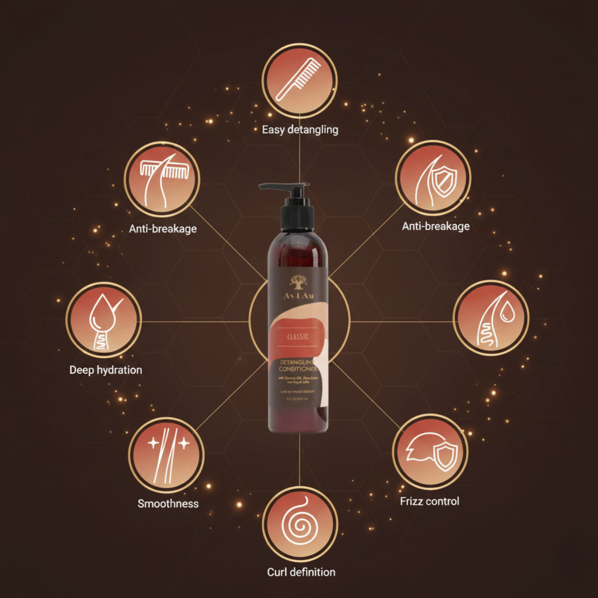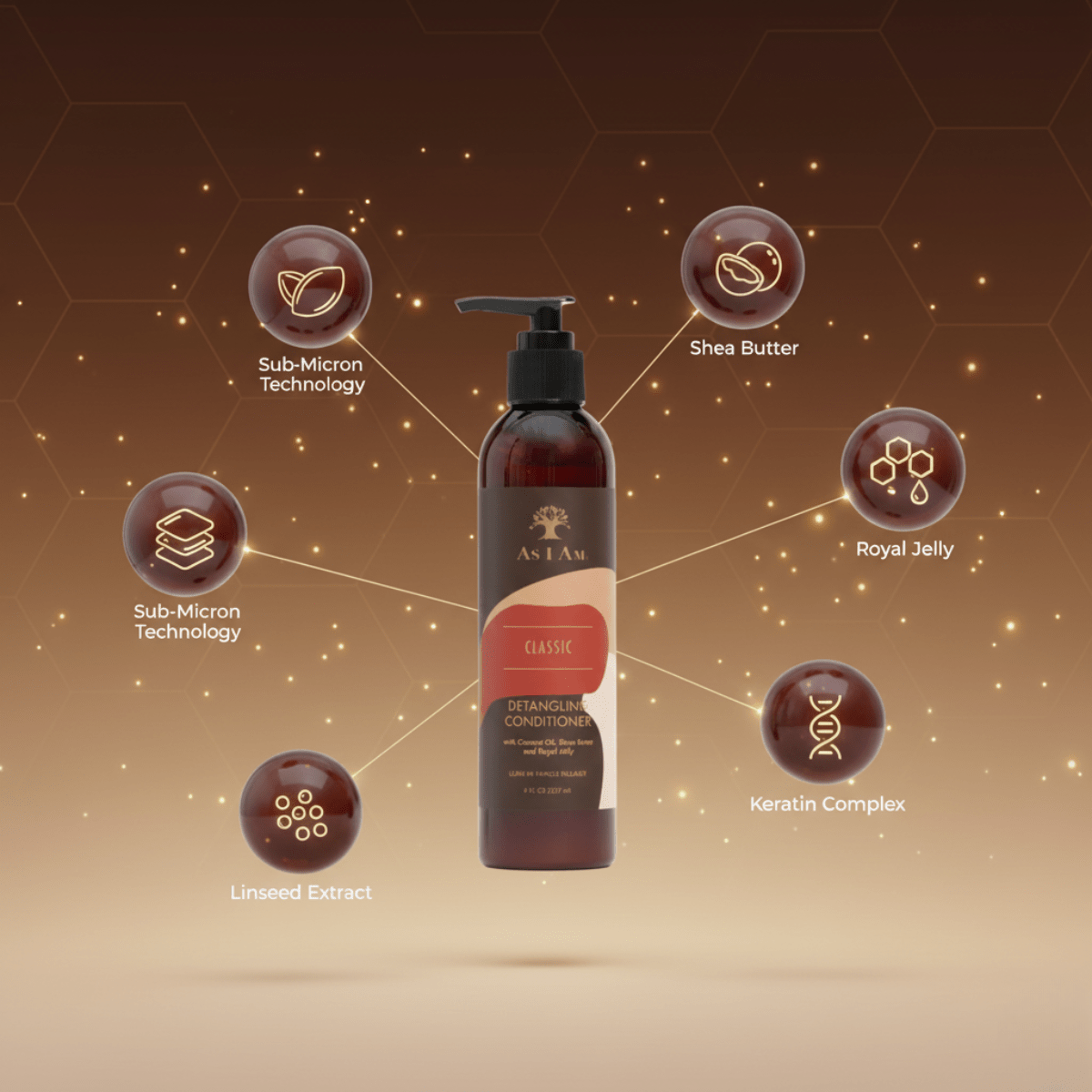 Sag Haarbruch, Knoten und Frizz endlich Lebewohl! Der As I Am Classic Detangling Conditioner wurde speziell entwickelt, um selbst sehr verknotetes, trockenes oder lockiges Haar schnell, sanft und effektiv zu entwirren. Die reichhaltige Formel spendet intensive Feuchtigkeit, stärkt die Haarstruktur und hinterlässt ein geschmeidiges, glänzendes und gesund aussehendes Finish.