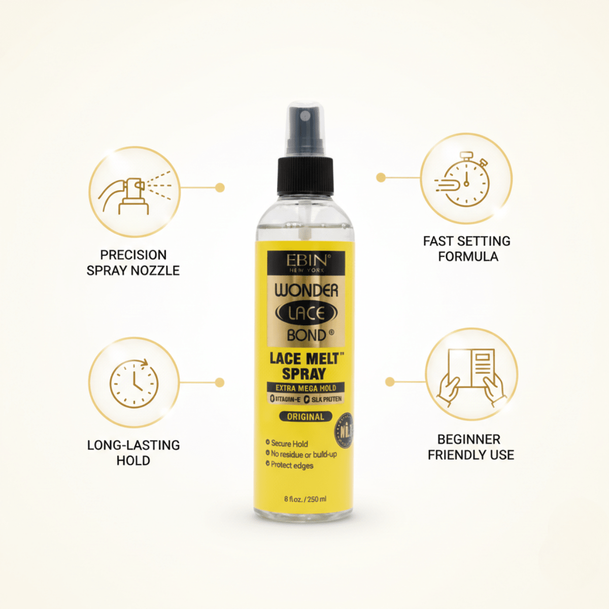 Das Ebin New York Wonder Lace Bond Melting Spray Extra Mega Hold Original 250ml ist die ultimative Lösung für alle, die einen perfekten, natürlichen und salonreifen Lace-Melt wünschen. Mit seiner leistungsstarken Extra-Mega-Hold-Formel bringt dieses Spray deine Lace-Spitze zum Schmelzen, sodass sie unsichtbar, sauber und professionell in deinen Haaransatz übergeht.