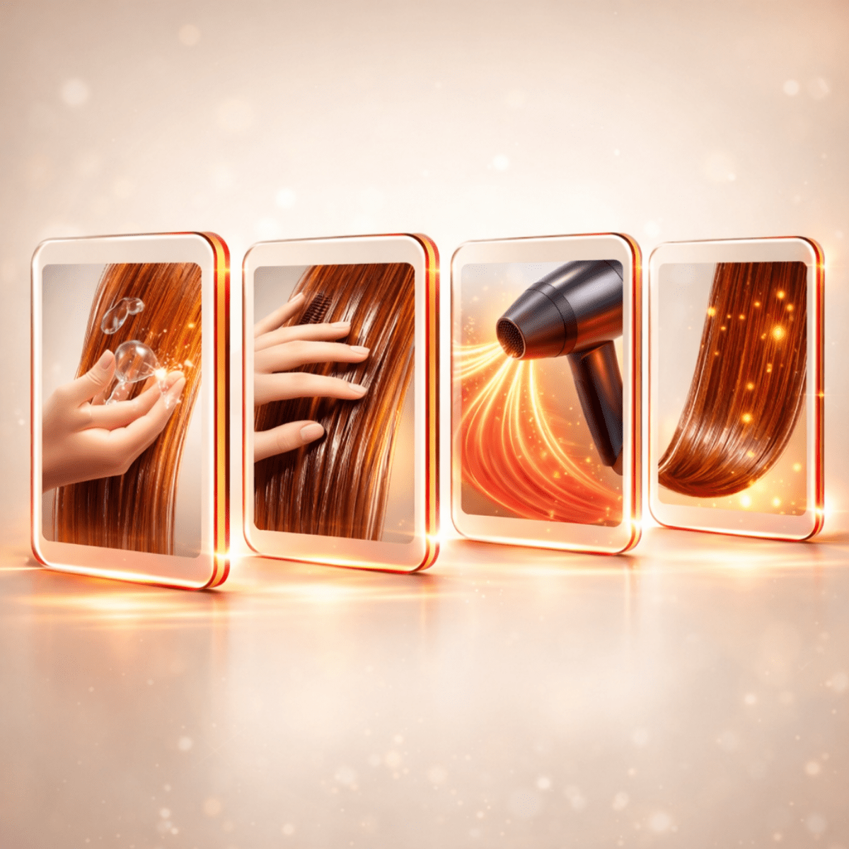 3️⃣ Mit Föhn, Glätteisen oder Lockenstab wie gewohnt stylen.