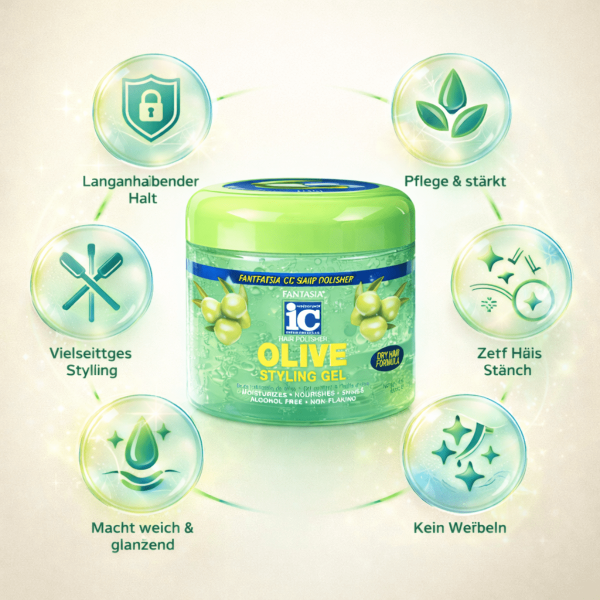 Wenn du Halt, Glanz und Pflege in einem einzigen Stylingprodukt suchst, ist dieses Gel dein neues Must-Have. Das Fantasia IC Hair Polisher Olive Styling Gel wurde entwickelt, um langanhaltende, definierte Styles zu kreieren – ohne Alkohol, ohne Schuppen und ohne fettige Rückstände. Die reichhaltige Kombination aus Olivenöl, Aloe Vera, Vitamin E und Seidenprotein pflegt das Haar intensiv und verleiht ihm bei jeder Anwendung geschmeidige Struktur und sichtbaren Glanz.