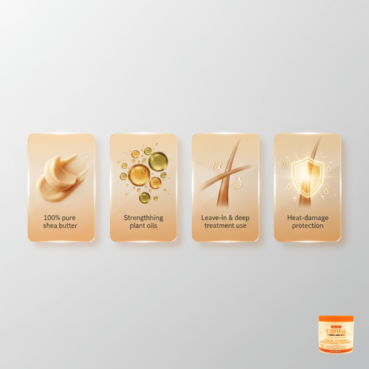 Wenn dein Haar unter Trockenheit, Brüchigkeit oder Strukturschäden leidet, braucht es mehr als eine einfache Pflege. Das Cantu Shea Butter Grow Strong Strengthening Treatment wurde entwickelt, um selbst stark strapaziertes Haar wieder aufzubauen. Mit 100 % reiner Sheabutter, nährenden Pflanzenölen und einer reichhaltigen, reparierenden Formel stärkt es jede Strähne vom Ansatz bis in die Spitzen – für dauerhaft kräftigeres, geschmeidigeres und glänzenderes Haar.