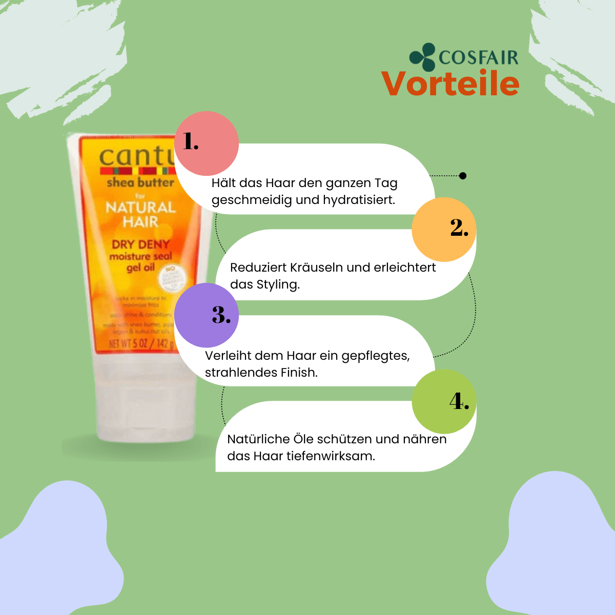 Cantu Dry Deny Gel Oil: Versiegelt Feuchtigkeit, reduziert Frizz & pflegt mit Sheabutter und Ölen. Perfekt für trockenes, krauses & strapaziertes Haar.