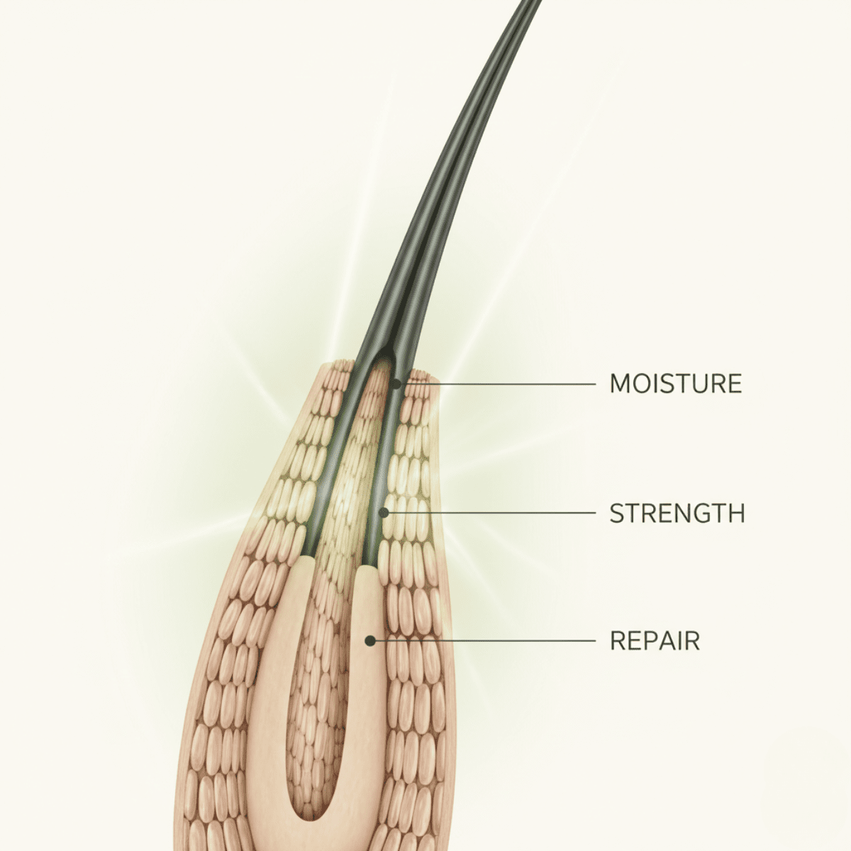 Die Kombination aus Olivenöl, Rizinusöl, Kokosöl und Mineralöl sorgt für eine kraftvolle Nährstoffversorgung, verbessert die Haarelastizität und schützt vor täglicher Austrocknung. Perfekt für glattes, lockiges oder grobes Haar – und für jede Länge geeignet.