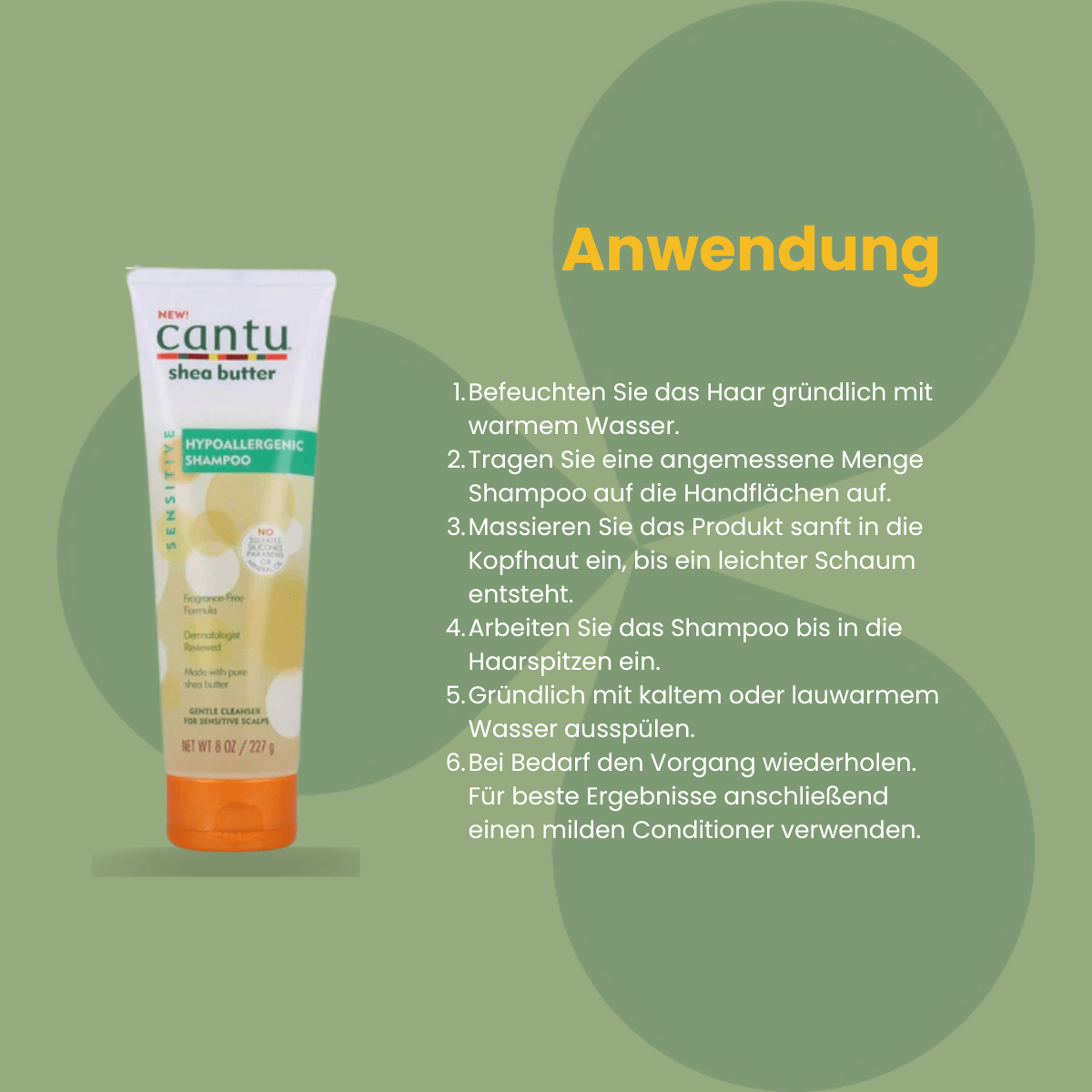 Hypoallergenes Cantu Sensitive Shampoo: sanfte Reinigung für empfindliche Kopfhaut, duftfrei, mit Shea-Butter & Pflanzenextrakten. Ideal für sensible Haut.