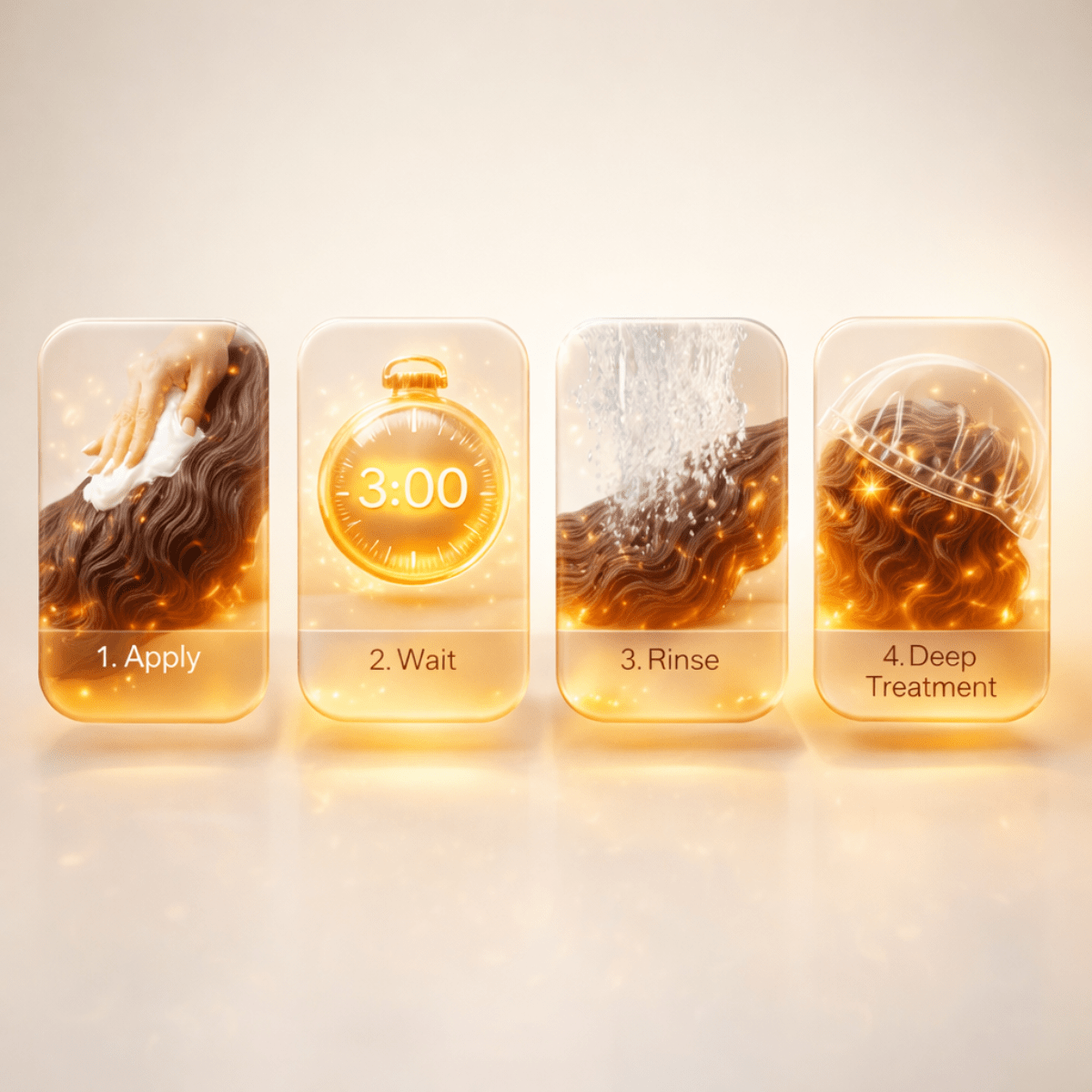 4️⃣ Für eine Intensivpflege Haar mit einer Plastikkappe abdecken und 10–15 Minuten einwirken lassen. Anschließend mit kaltem Wasser ausspülen.
