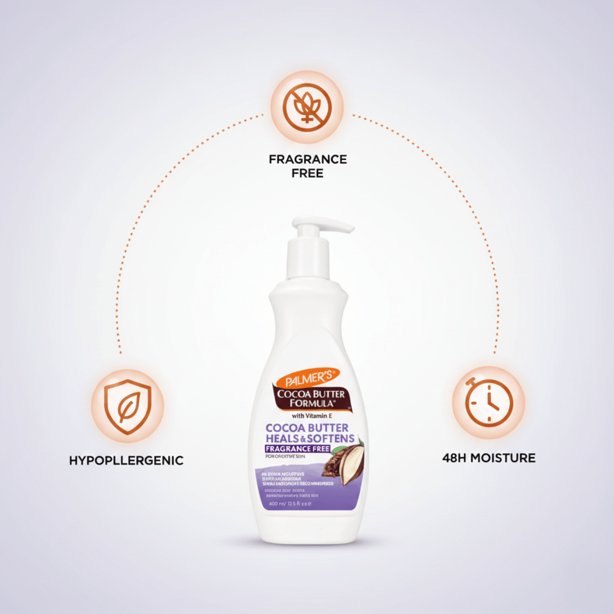 Wenn Ihre Haut rau, trocken oder besonders sensibel ist, braucht sie eine Pflege, die nicht nur Feuchtigkeit spendet, sondern sie auch beruhigt, schützt und nachhaltig glättet – ganz ohne Reizstoffe. Die duftfreie Palmer's Cocoa Butter Formula liefert genau das: eine hochkonzentrierte, hypoallergene Feuchtigkeitsformel, angereichert mit reiner Kakaobutter und Vitamin E, die die Haut spürbar geschmeidig macht und ihre natürliche Barriere stärkt.