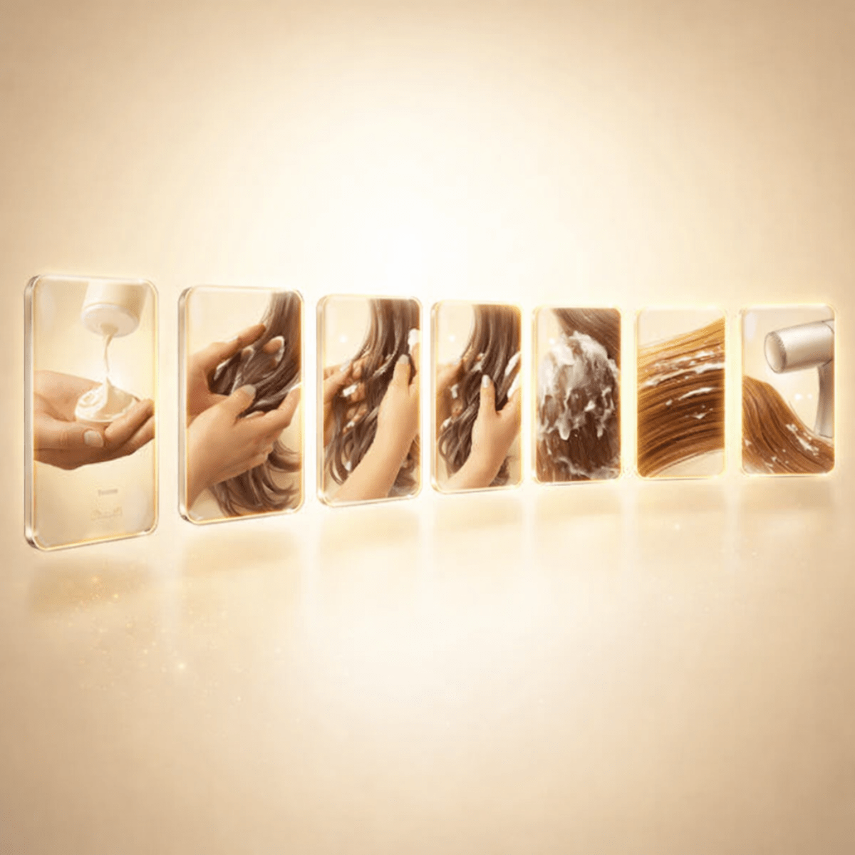2️⃣ Auf feuchtes oder trockenes Haar auftragen, beginnend in den Spitzen