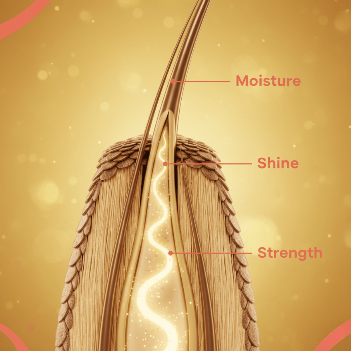 1️⃣ Eine kleine Menge auf trockene Stellen wie Haar, Kopfhaut, Haut oder Nägel auftragen – täglich oder nach Bedarf.