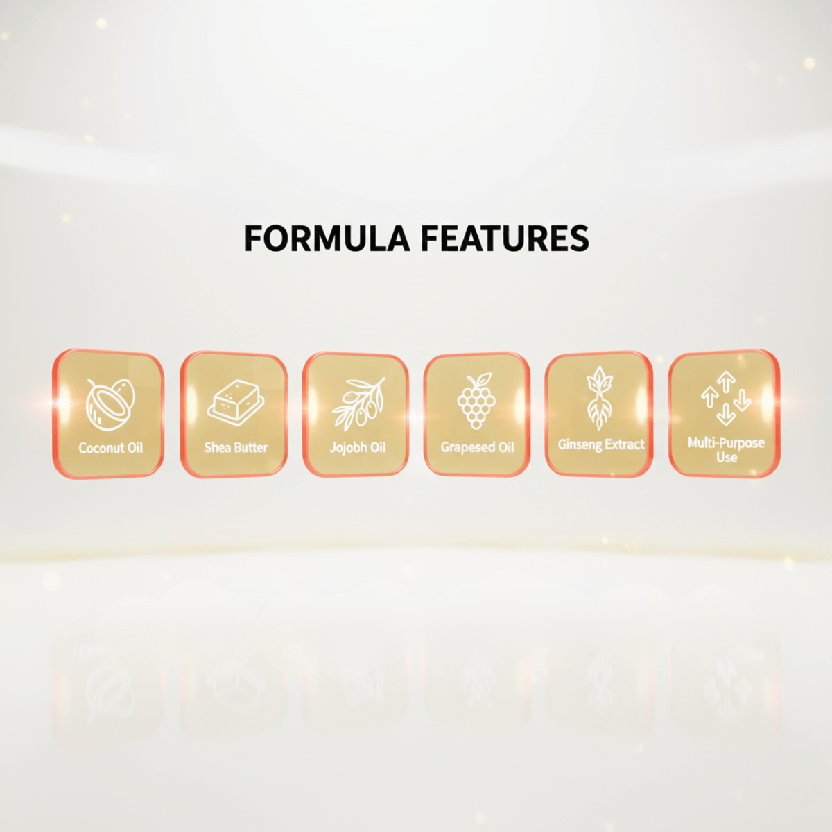 Mit einer nährenden Mischung aus Kokosöl, Traubenkernöl, Jojobaöl, Sheabutter und Ginseng versorgt dieses Öl trockene Kopfhaut, krauses Haar, strapazierte Haut und brüchige Nägel mit intensiver Feuchtigkeit, ohne die Poren zu verstopfen. Perfekt für Haartypen von 3a–4c und alle Hauttypen.