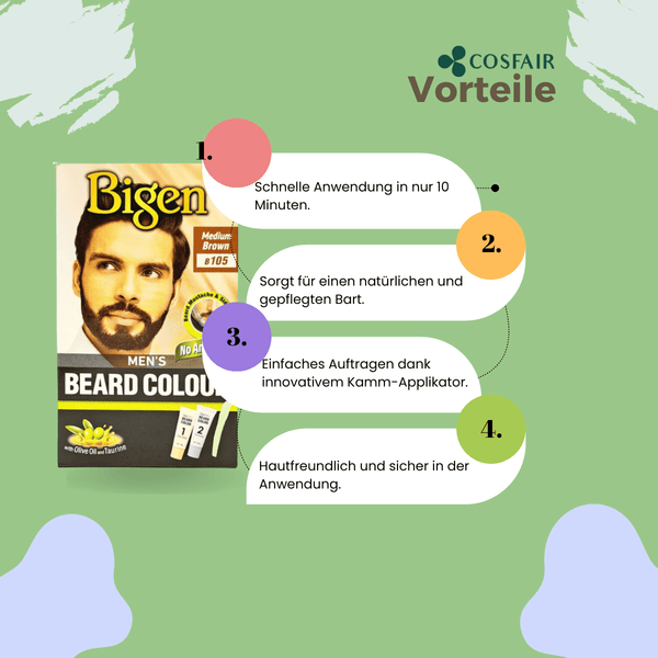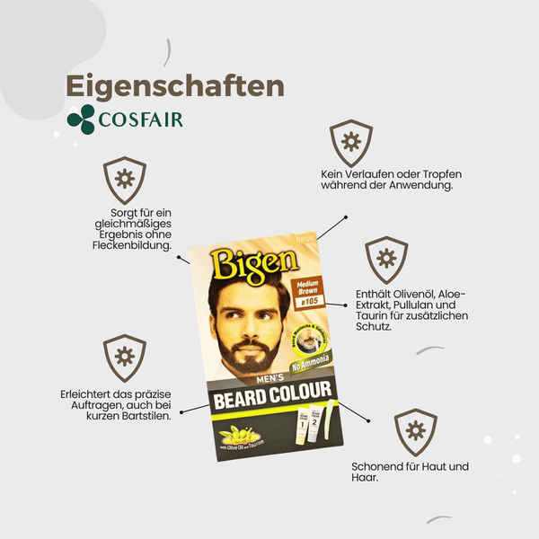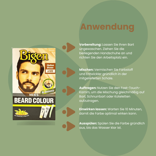 Bigen Men's Beard Colour B105 Medium Brown perfectly covers grey and does not stain the skin. The fast-touch comb makes it easy to apply to any part of the beard or mustache, even on short styles. The colour does not drip and effortlessly reaches every area of the beard, even on shorter styles. Bigen Men's Beard Colour B105 Medium Brown contains olive oil, aloe extract, pullulan and taurine, but no ammonia.