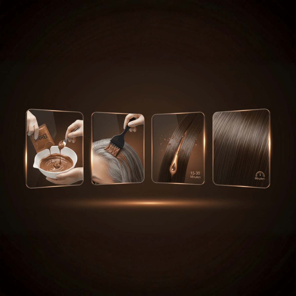 3️⃣ Auftragen Farbe auf trockenes Haar auftragen, besonders auf graue Partien. Gleichmäßig durchkämmen.