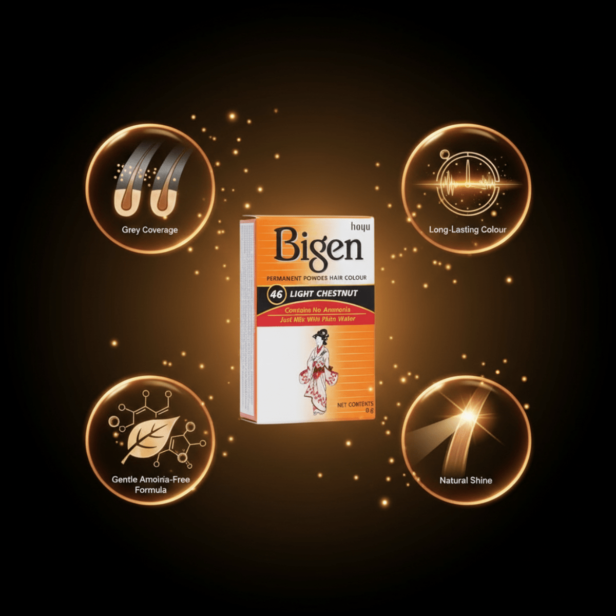 Bigen Powder Hair Colour 46 Light Chestnut – ammoniakfreie, langanhaltende Haarfarbe mit natürlicher Grau-Abdeckung & warmem Kastanienton für glänzendes, gesundes Haar.
