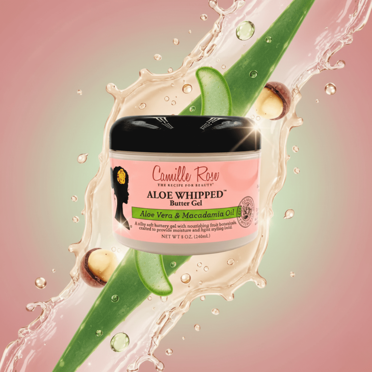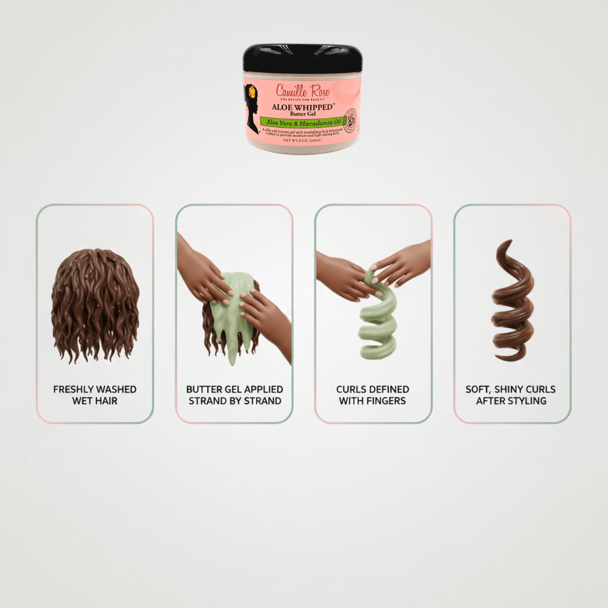 Camille Rose Aloe Whipped Butter Gel is ideal for natural, colored and chemically treated hair. This moisturizing cream-based gel keeps your style in place without leaving it hard or crunchy. Enriched with rich oils for nourishing properties and vitamins for scalp care. Defines curls with light hold and maximum moisture. Made in the USA.