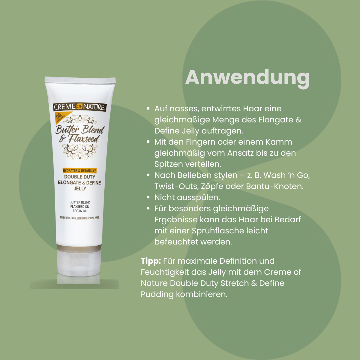 Creme of Nature Double Duty Elongate & Define Jelly, enriched with a butter blend, linseed oil and argan oil, minimizes hair's natural shrinkage, leaving locks elongated and helping to define curls while moisturizing throughout the day. This lightweight, multi-purpose styling gel has a light hold and is perfect for smoothing flyaways, eliminating frizz and controlling edges.