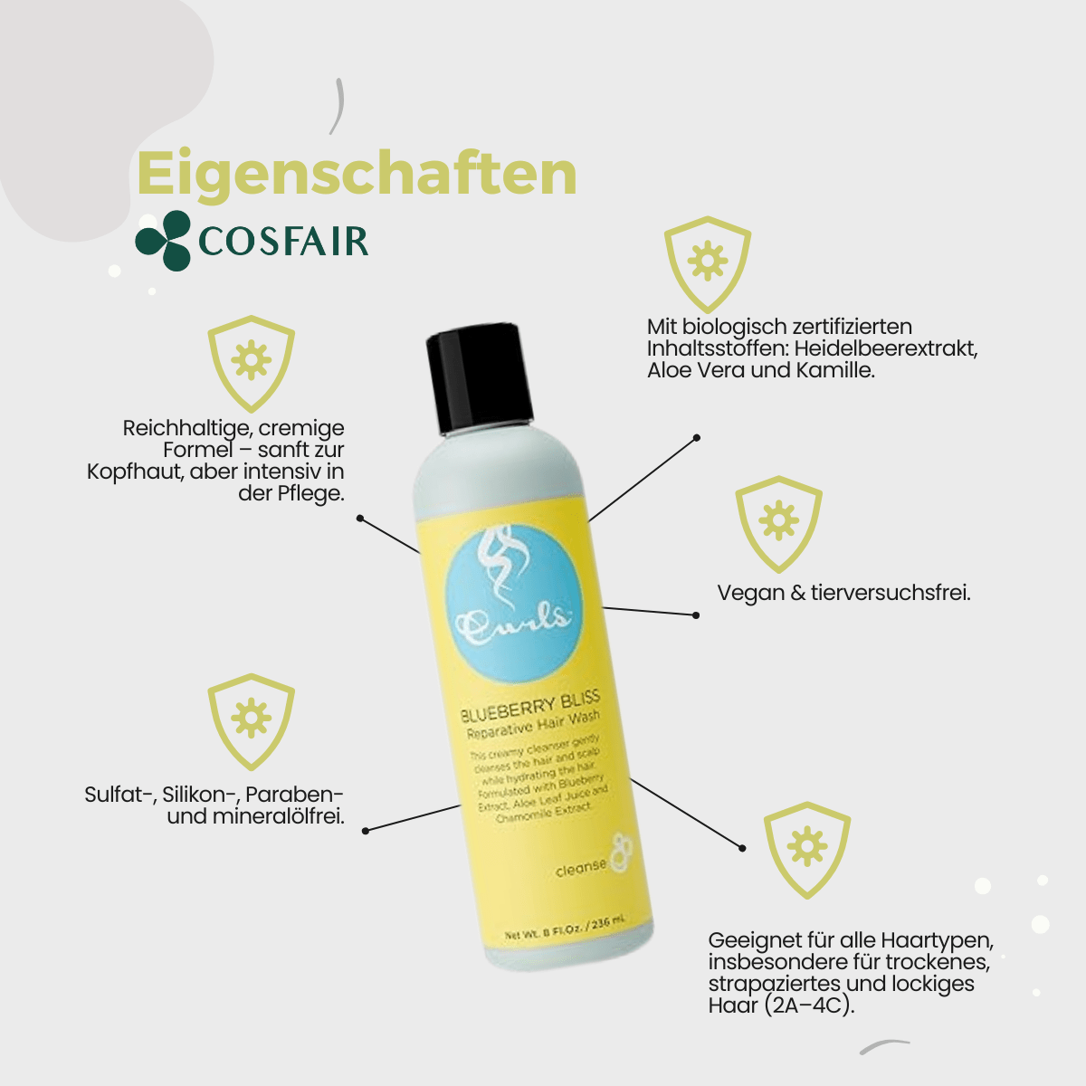 Curls Blueberry Bliss Reparative Hair Wash is a rich, sulfate-free cleanser that softens and moisturizes the driest of curls and promotes scalp health and hair growth. Formulated with certified organic blueberry extract, aloe leaf juice and chamomile extract, it is clinically proven to REPAIR, PROTECT, RESTORE and promote GROWTH in your curls.