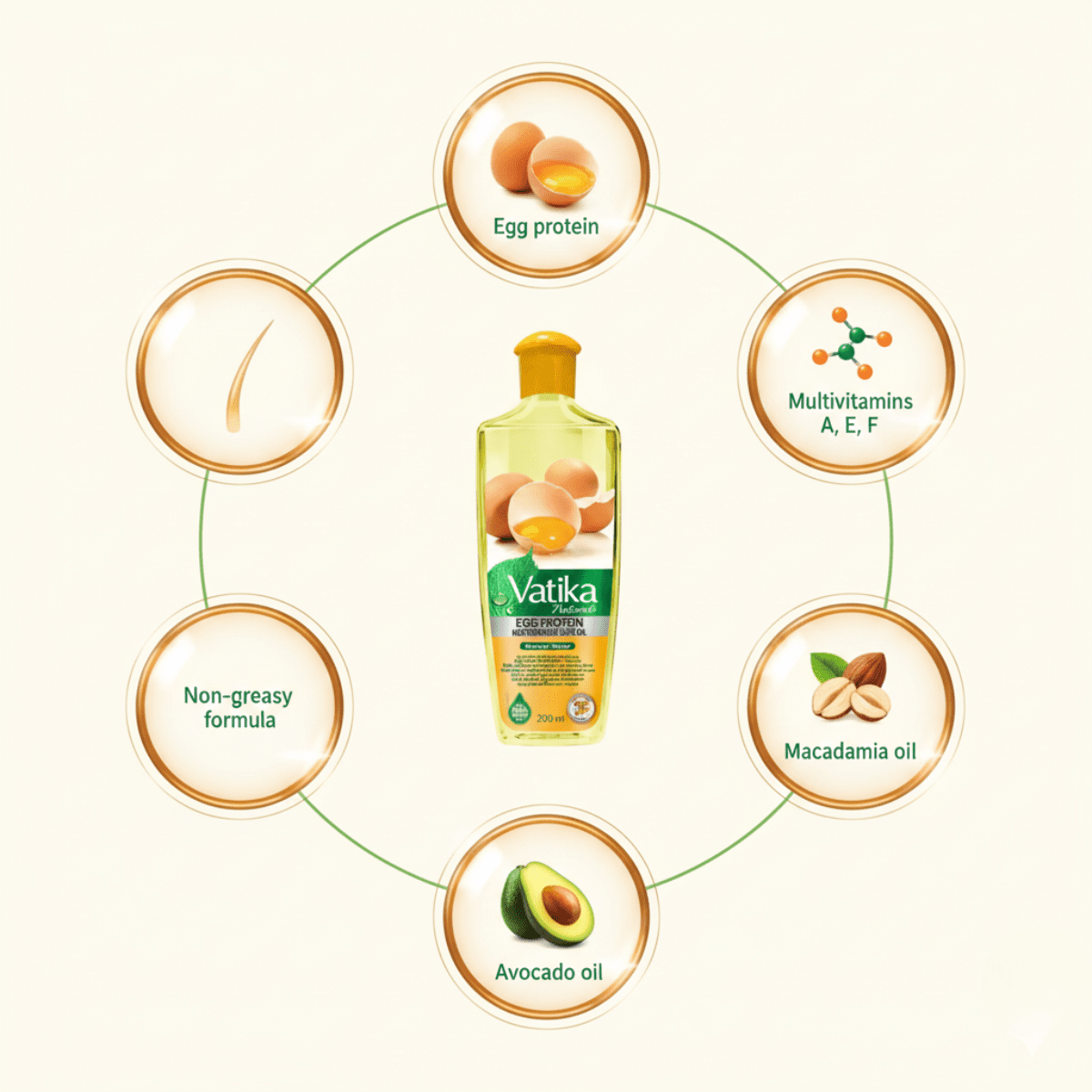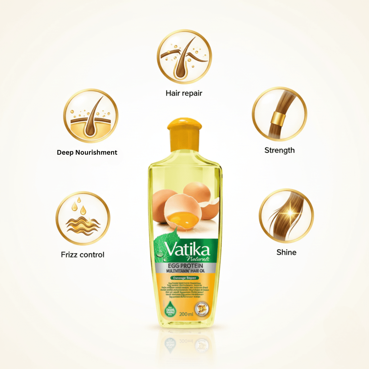 Vatika Egg-Protein Multivitamin Hair Oil stärkt, repariert und pflegt geschädigtes Haar. Mit Eiprotein, Vitaminen & nährenden Ölen für Glanz, Geschmeidigkeit und reduzierte Haarbruchrate.