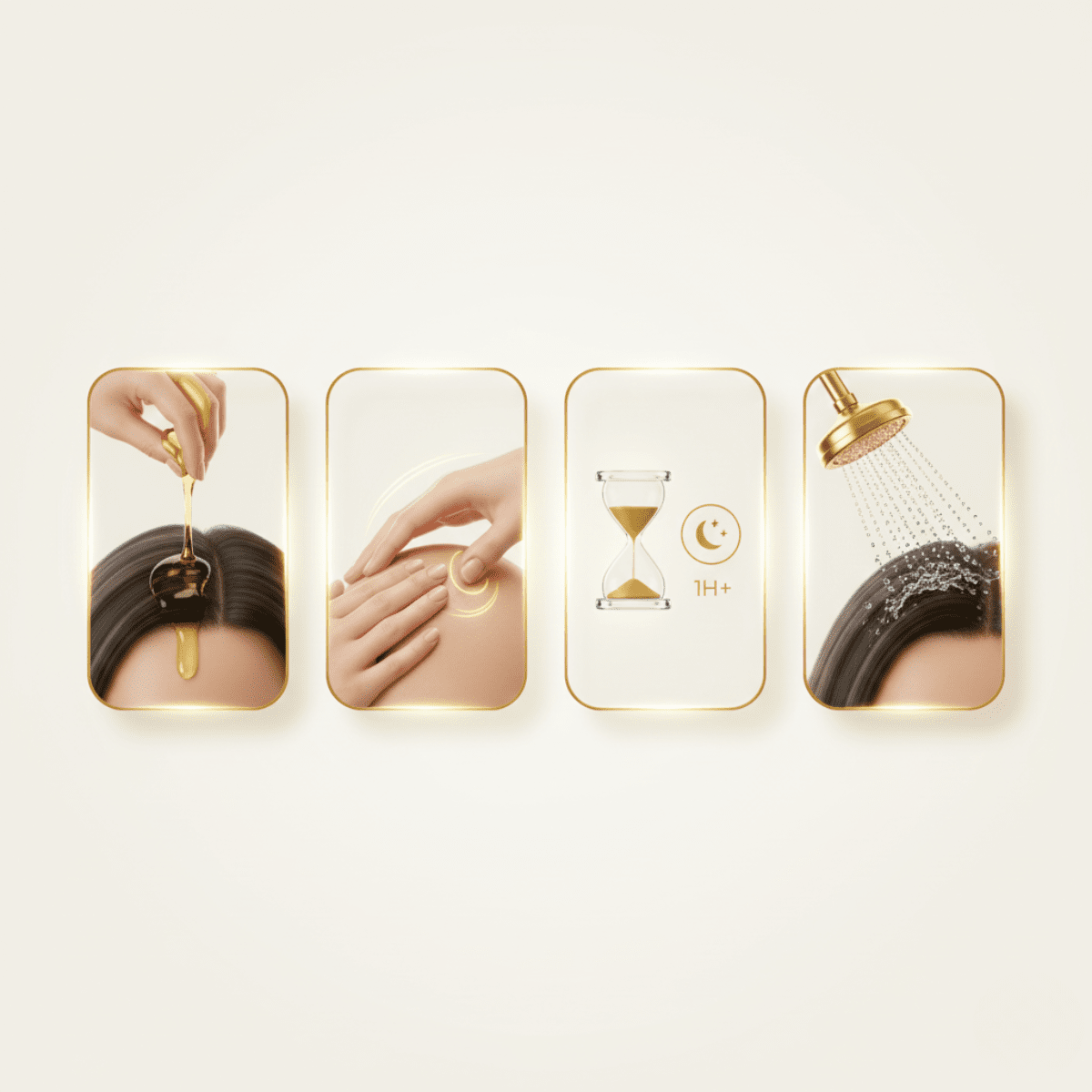1️⃣ Öl großzügig auf die Kopfhaut und Haarlängen auftragen.