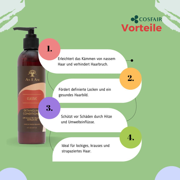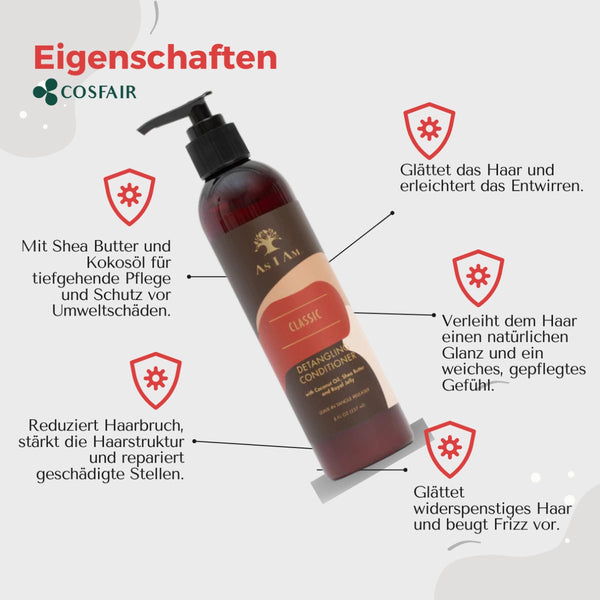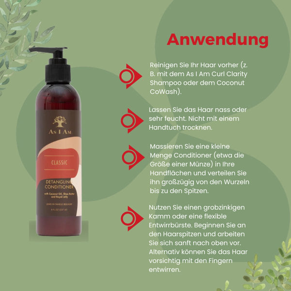 Sag Haarbruch, Knoten und Frizz endlich Lebewohl! Der As I Am Classic Detangling Conditioner wurde speziell entwickelt, um selbst sehr verknotetes, trockenes oder lockiges Haar schnell, sanft und effektiv zu entwirren. Die reichhaltige Formel spendet intensive Feuchtigkeit, stärkt die Haarstruktur und hinterlässt ein geschmeidiges, glänzendes und gesund aussehendes Finish.