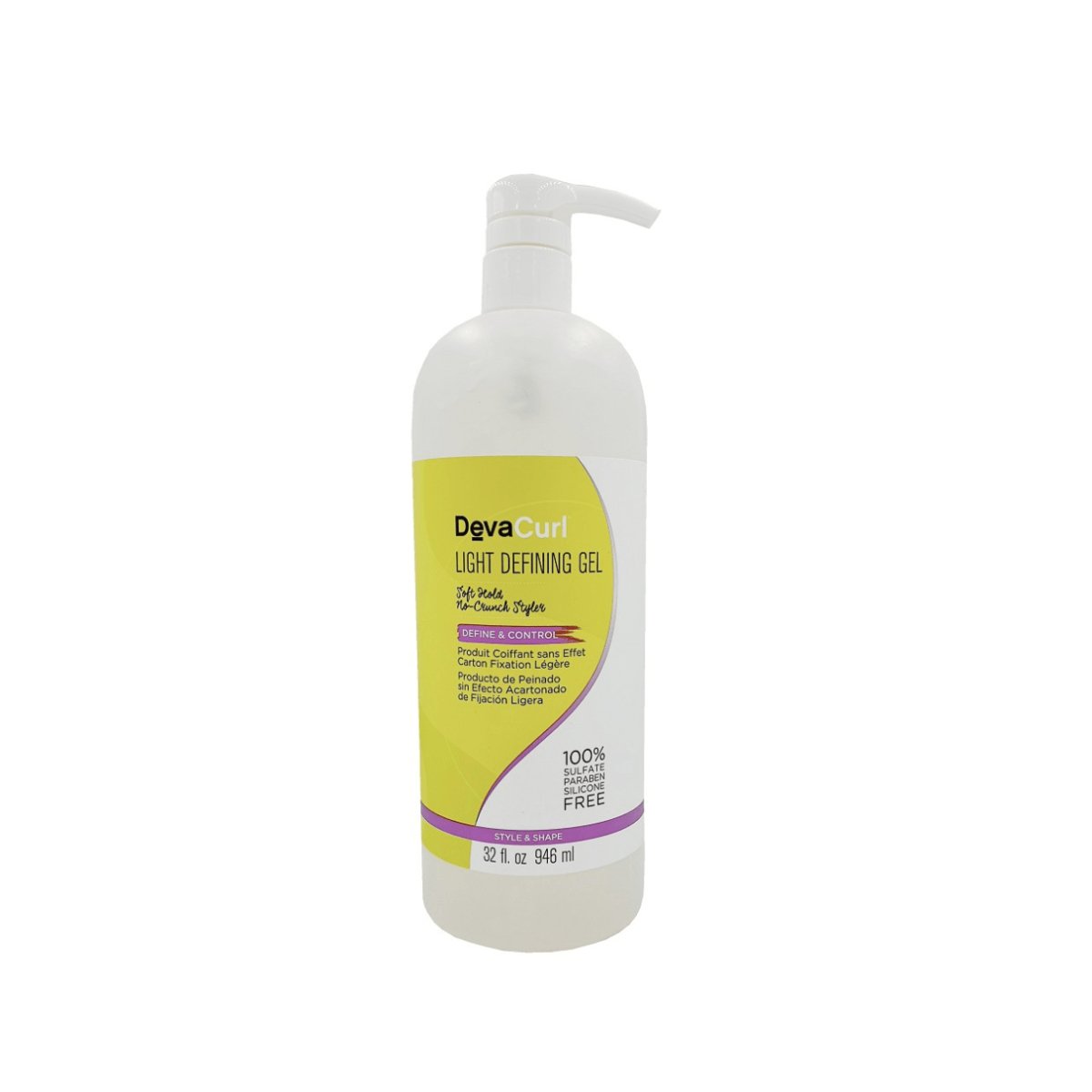 Deva Curl Light Defining Gel (Soft Hold No-Crunch Styler) in 946ml is a light hold gel that defines curl shape without stickiness. Formulated with wheat and soy proteins to lock in moisture, it adds shine and bounce while controlling frizz.