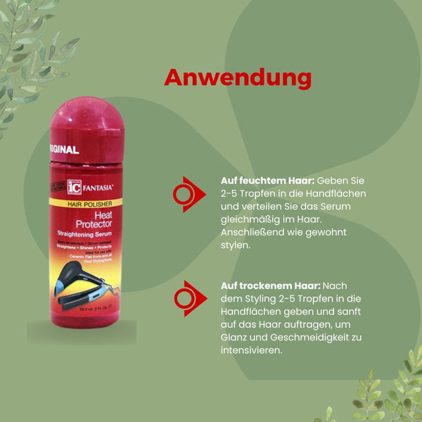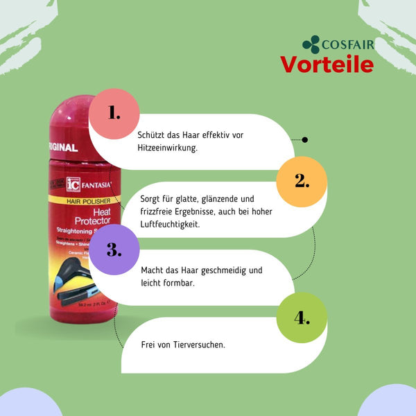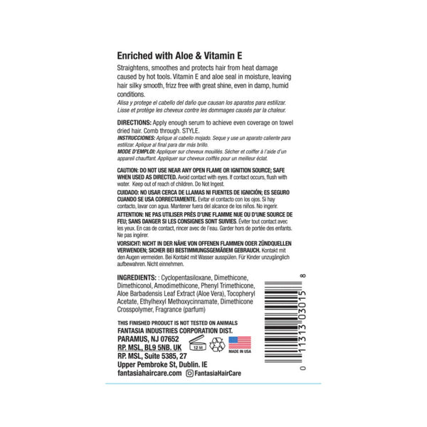 Fantasia IC Heat Protector Straightening Serum smoothes and protects hair from heat damage caused by hot tools. Vitamin E and silicone seal in moisture and leave hair silky smooth, frizz-free and shiny, even in humid conditions. The serum leaves hair silky soft and gives it a vibrant shine. It eliminates frizz, prevents static and shortens drying time. It also improves fullness and combability.