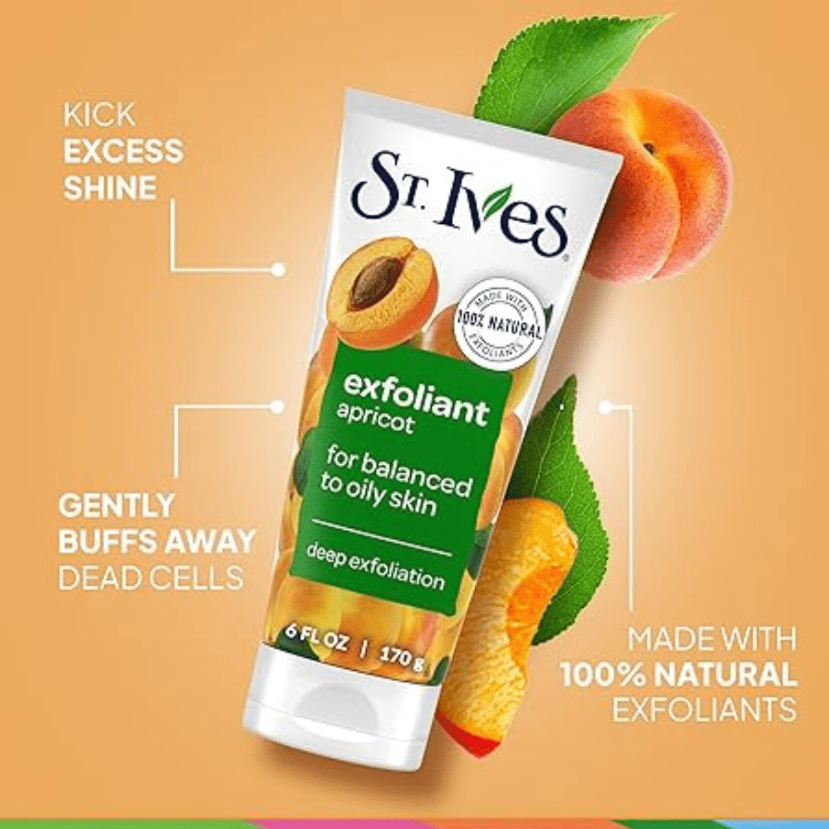 ST. Ives Fresh Skin Apricot Scrub 170g, America's #1 exfoliating brand, provides deep exfoliation and removes impurities for clean, glowing skin. The facial scrub contains 100% natural walnut shell powder and apricot fruit extract for a super soft skin feel.
