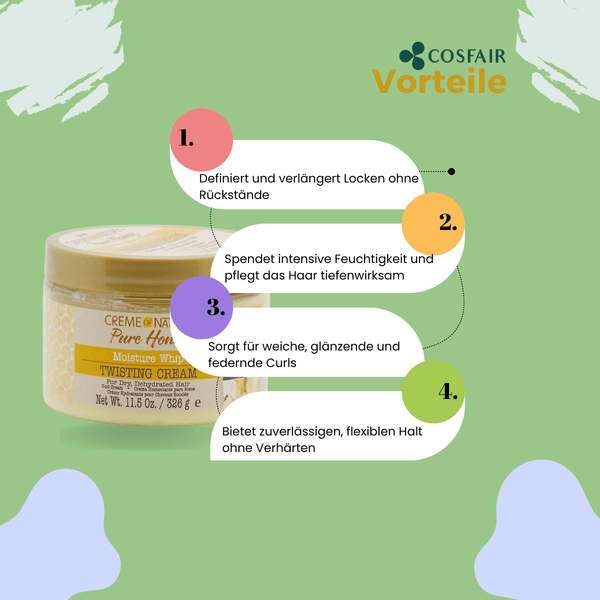 Defines and lengthens curls with pure honey. Enriched with certified natural coconut oil and shea butter for long-lasting hold and shine. Creme of Nature Pure Honey Moisture Whip Twisting Cream's ultra-moisturizing formula targets dry and dehydrated hair to leave curls soft, shiny and defined.