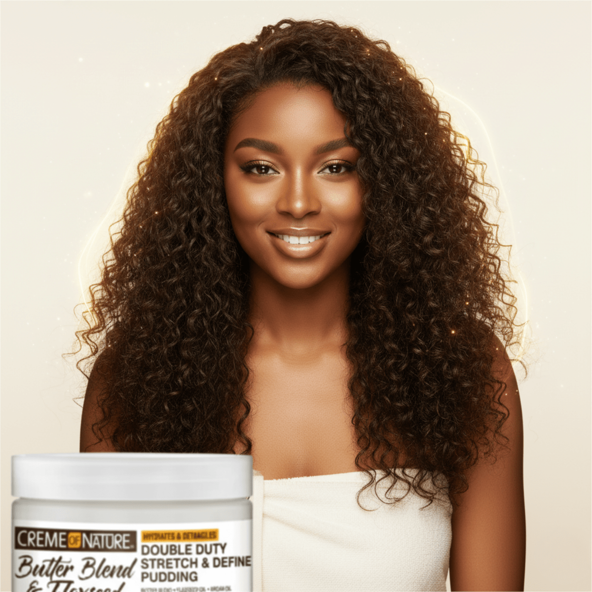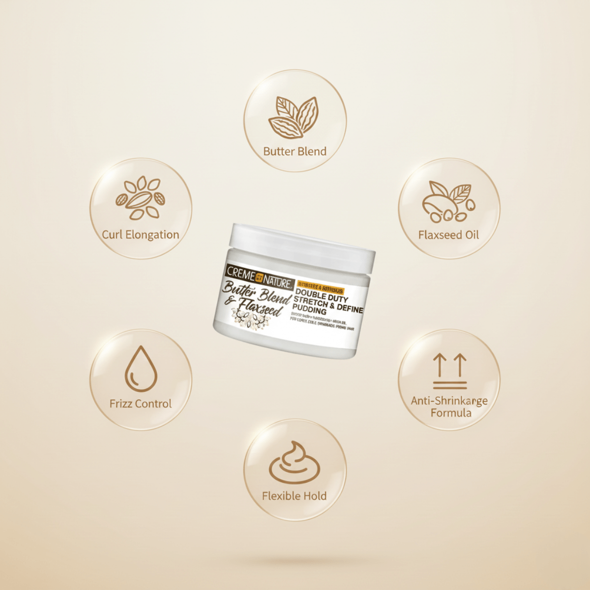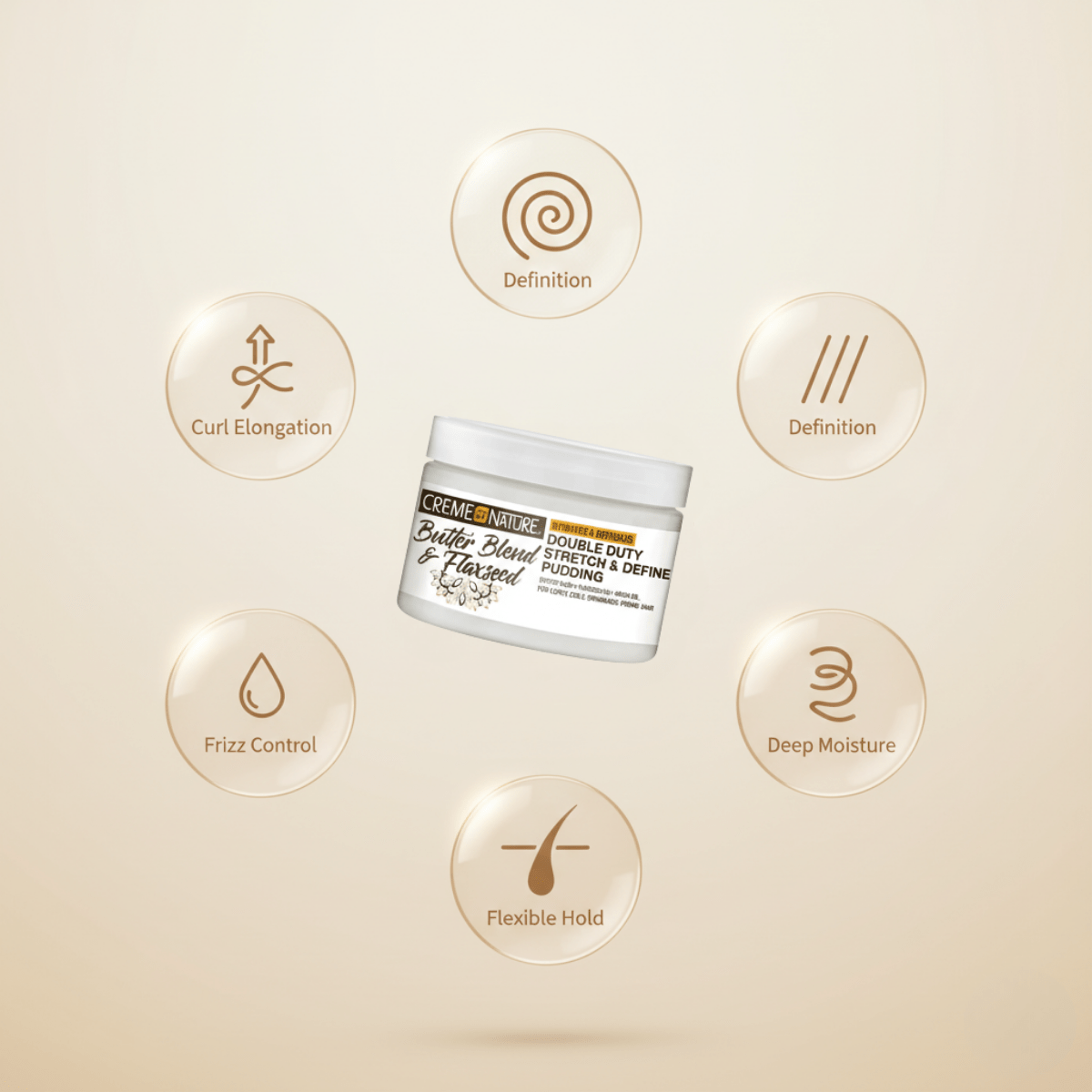Creme of Nature Double Duty Stretch & Define Pudding is enriched with a butter blend, linseed oil and argan oil. This moisturizing, anti-shrinkage formula improves curl definition and creates soft, stretched curls. With a light hold, it's ideal for straightening hair for a frizz-free finish, as well as defining twist and braid-out styles.