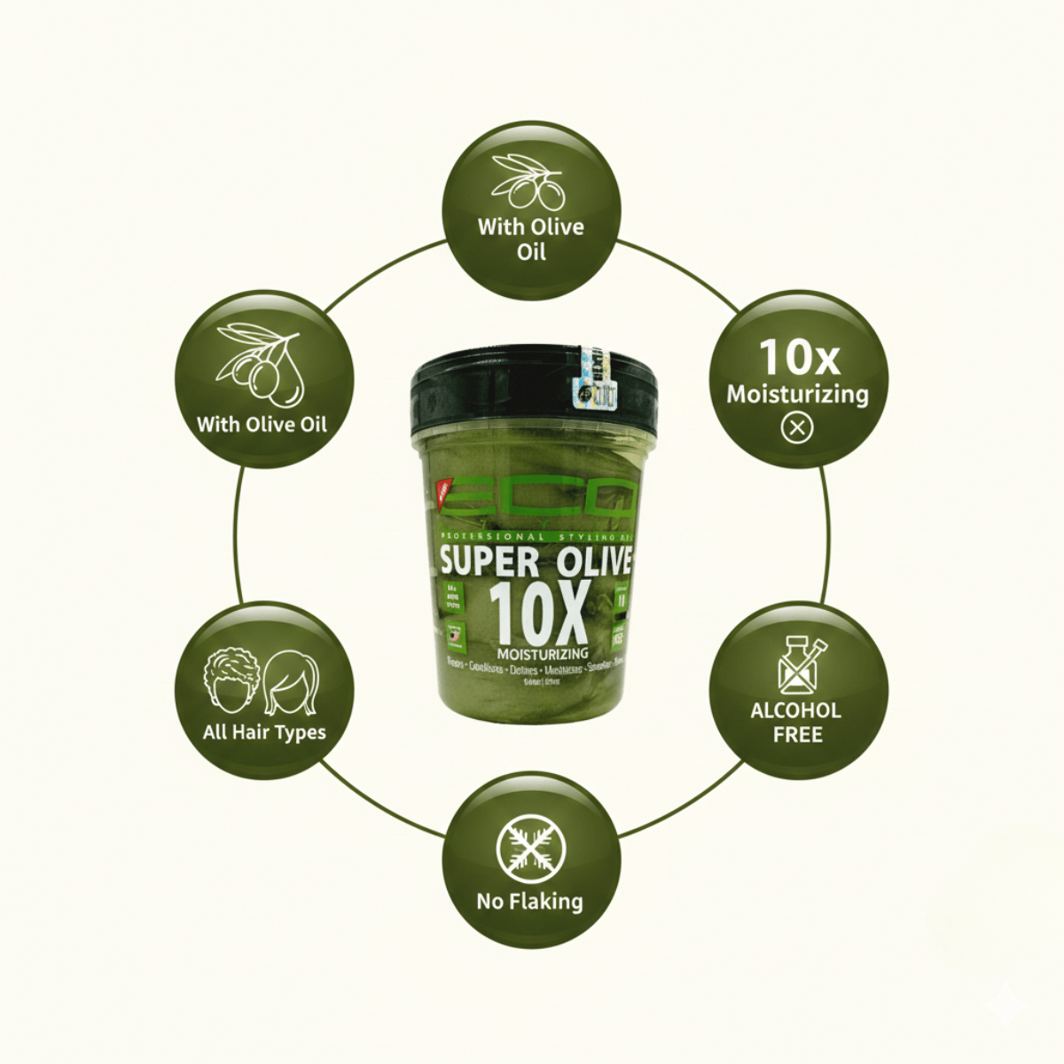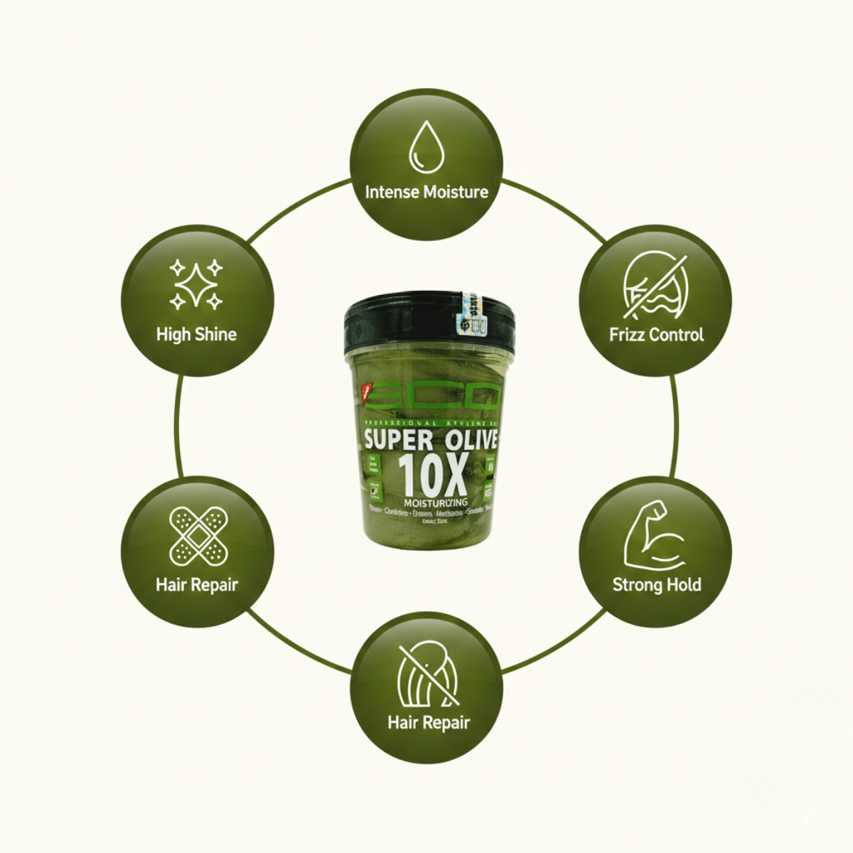 It ensures maximum hold, defines your hair and ensures a flawless look all day long. The Eco Styler Super Olive 10x Moisturizing Gel 973ml repairs, nourishes, moisturizes, soothes and gives your hair shine.