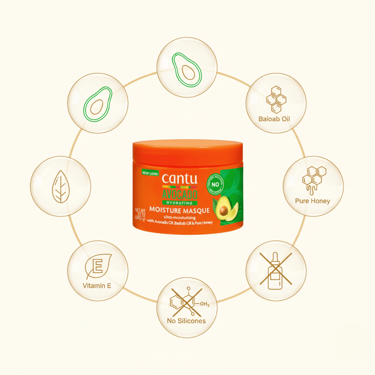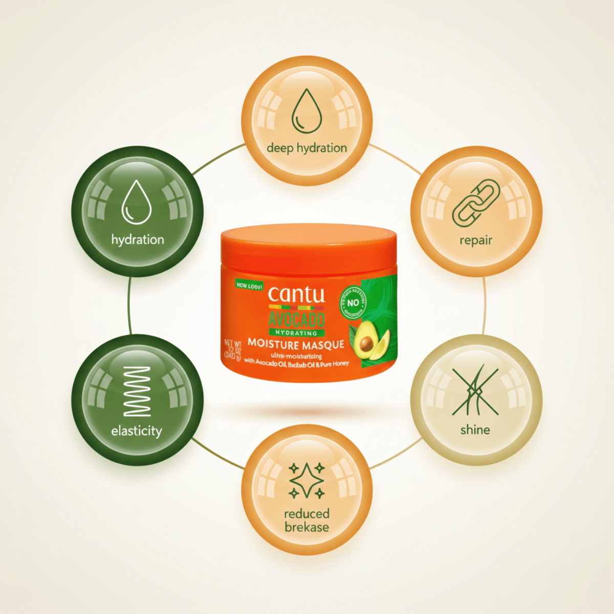Die Cantu Avocado Hydrating Hair Masque ist die perfekte Intensivkur für trockenes, sprödes oder geschädigtes Haar. Mit einer kraftvollen Mischung aus Avocadoöl, Baobaböl, Honig sowie Vitamin E & B dringt die reichhaltige Maske tief in die Haarstruktur ein, spendet intensive Feuchtigkeit und stärkt das Haar von innen heraus. Das Ergebnis: geschmeidiges, elastisches, glänzendes Haar, das sich wieder gesund anfühlt.