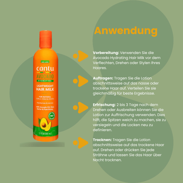 Leichte Cantu Avocado Hair Milk: Feuchtigkeit ohne Beschweren, definierte Locken & Frizz-Kontrolle. Mit Avocadoöl, Sheabutter & Honig für weiches, gesundes Haar.