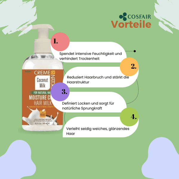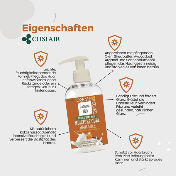 Creme of Nature Coconut Milk Moisture Curl Hair Milk moisturizes your hair. This lightweight hair milk lengthens curls, prevents breakage and softens hair. Enriched with certified natural coconut oil, Moisture Curl Milk improves the combability of your hair, tames frizz and adds shine!