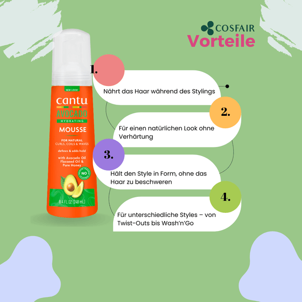 Das Cantu Avocado Hydrating Styling Mousse ist die perfekte Wahl für alle, die definierte, hydratisierte und natürlich schöne Locken wollen – ohne Verkleben, ohne Austrocknen und ohne Crunch-Effekt. Die pflegende, ultraleichte Schaumtextur kombiniert Avocadoöl, Leinsamenöl, Honig und Vitamin E, um das Haar während des Stylings tiefenwirksam zu nähren und gleichzeitig für langanhaltende Definition zu sorgen.