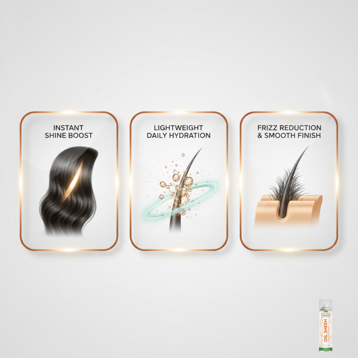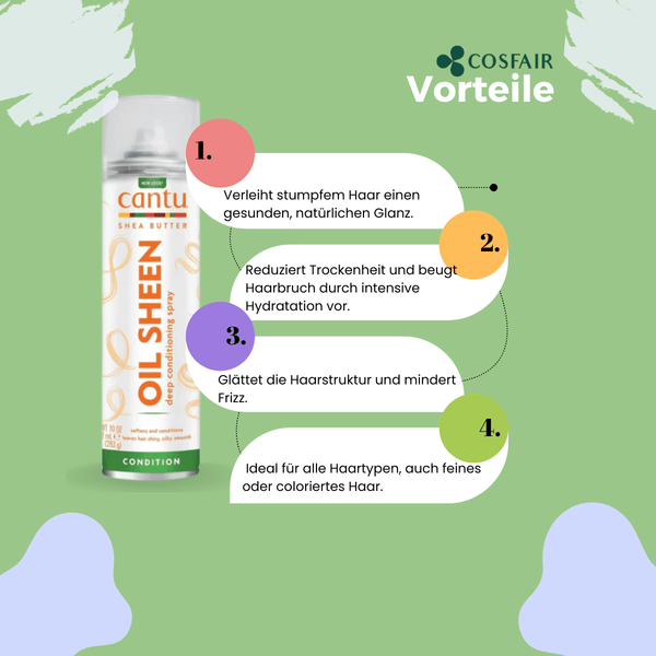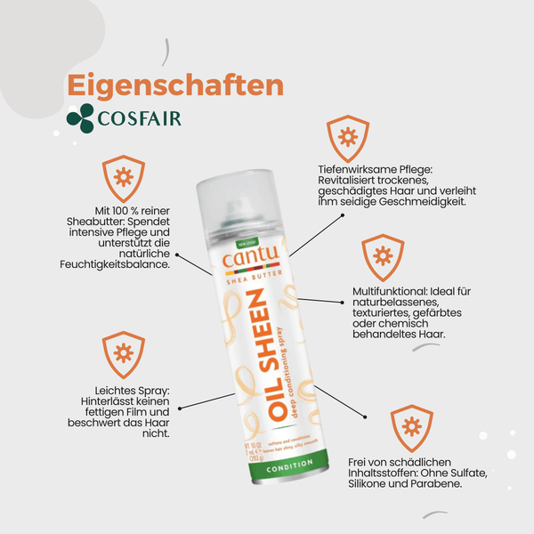 Cantu Shea Butter Oil Sheen Spray contains 100% pure shea butter and emollients to replace the vital oil in your hair. The result: stronger, healthier hair with natural shine. The non-sticky, intensely nourishing shine does not weigh down your hair. Ideal for relaxed, natural, textured, color-treated and permed hair.