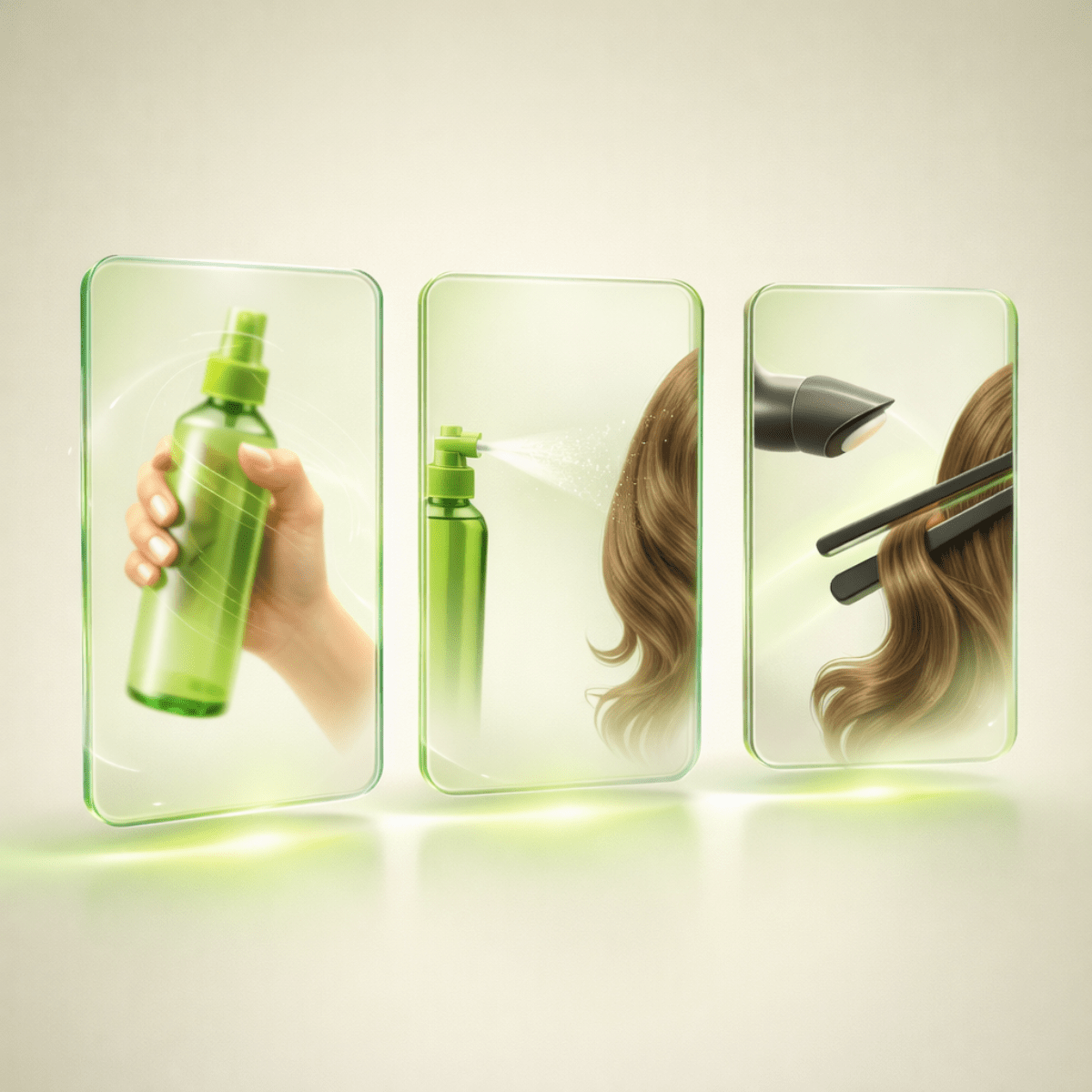 2️⃣ Aus 20–25 cm Entfernung gleichmäßig auf das Haar sprühen.