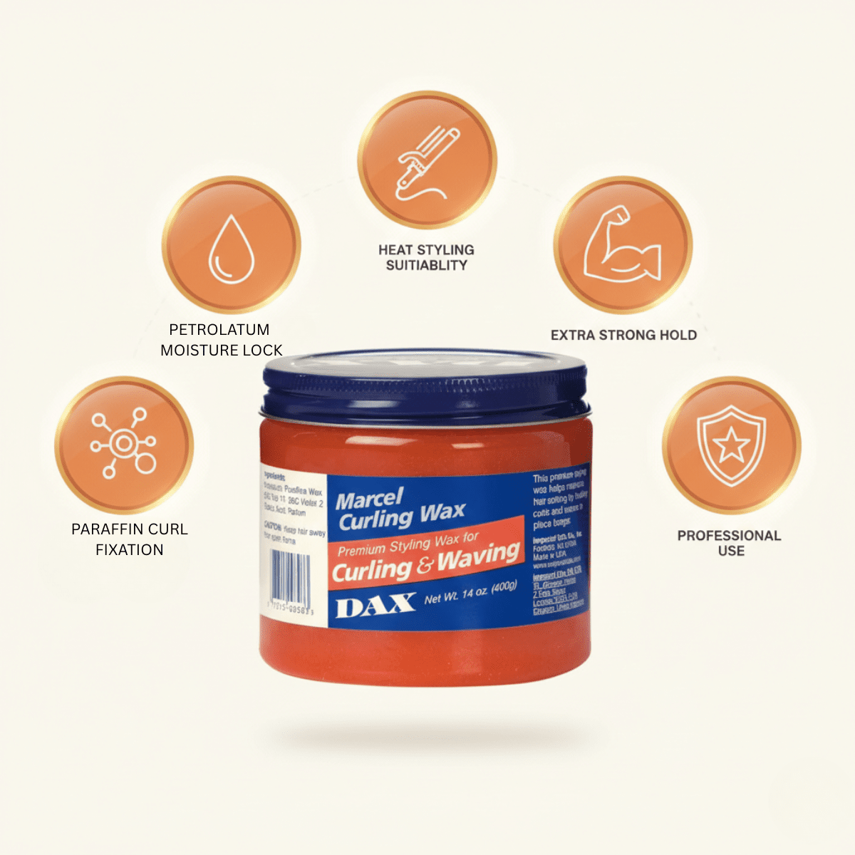Dax Marcel Curling Wax 397g offers the ideal styling aid for curly and wavy hair. The special ingredients in this premium styling wax help to maintain hair hold, meaning curls and waves stay in place longer. This product enables perfect styling, defines curls and gives your hair an attractive look. Say goodbye to frizzy hair and enjoy long-lasting, well-groomed curls with Curling Wax.