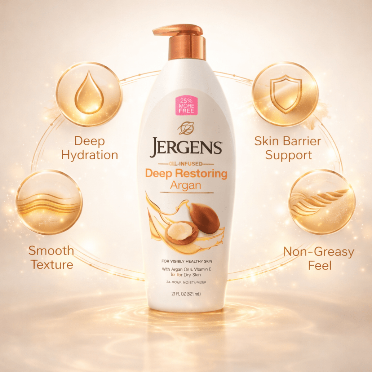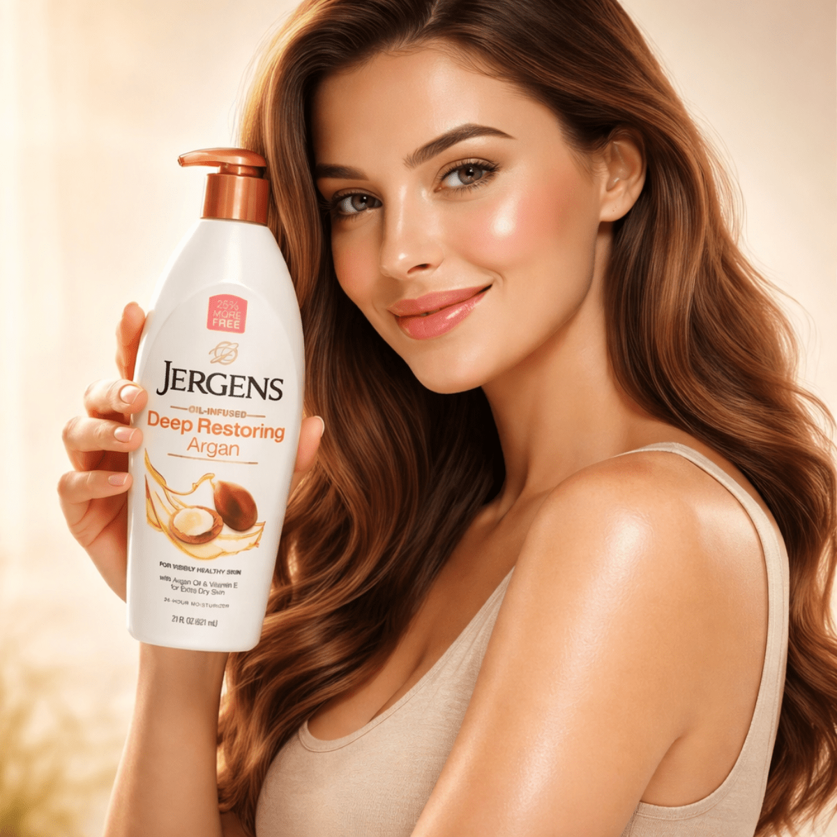 Pamper yourself with Jergens Deep Restoring Argan Moisturizer! This oil-infused moisturizer is nourishing and restorative with essential ingredients that give your skin the daily hydration it needs. Argan oil, often called "liquid gold," combines with skin-softening vitamin E for a formula that leaves skin silky smooth and visibly healthy for full-body hydration.