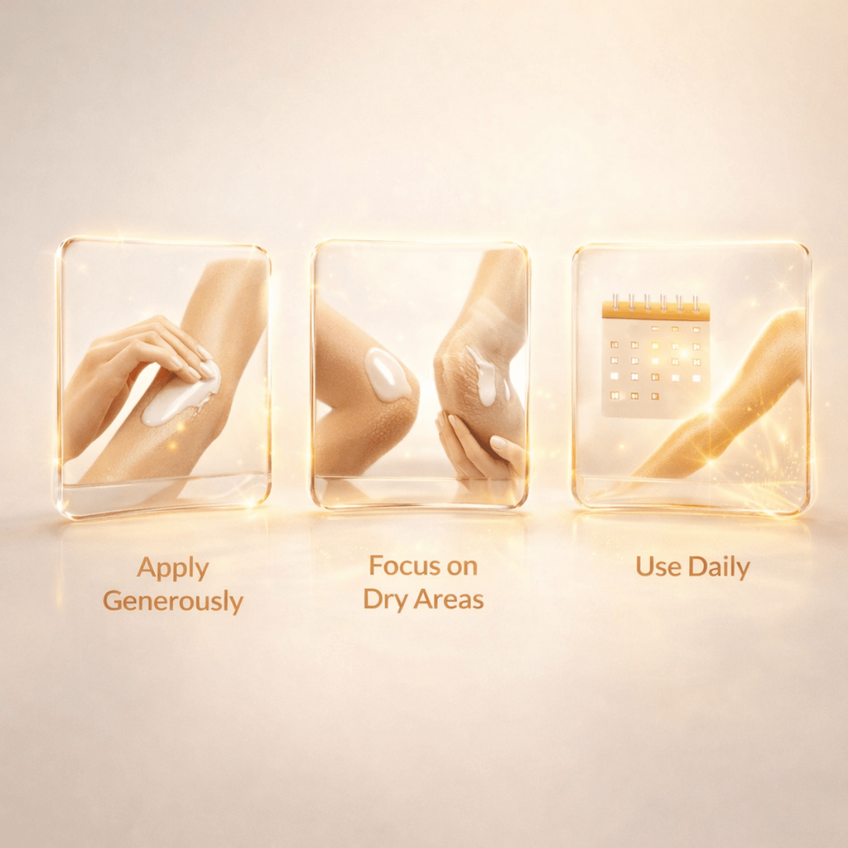 2️⃣ Besonders trockene oder raue Bereiche wie Knie, Fersen und Ellbogen intensiver eincremen.