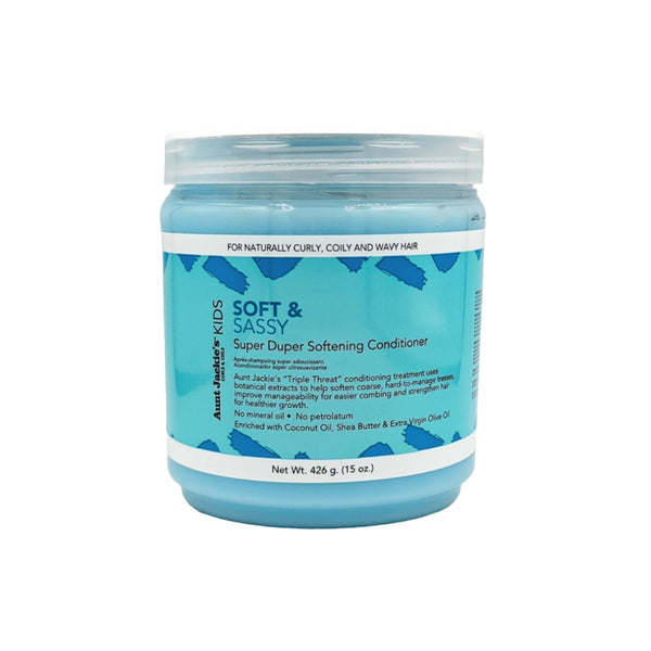 Aunt Jackie's Soft & Sassy Super Duper Softening Conditioner uses plant extracts to soften coarse, difficult to manage hair. Improves manageability for easier combing and strengthens hair for healthier growth. Use as a regular rinse-out conditioner, co-wash or deep conditioner.