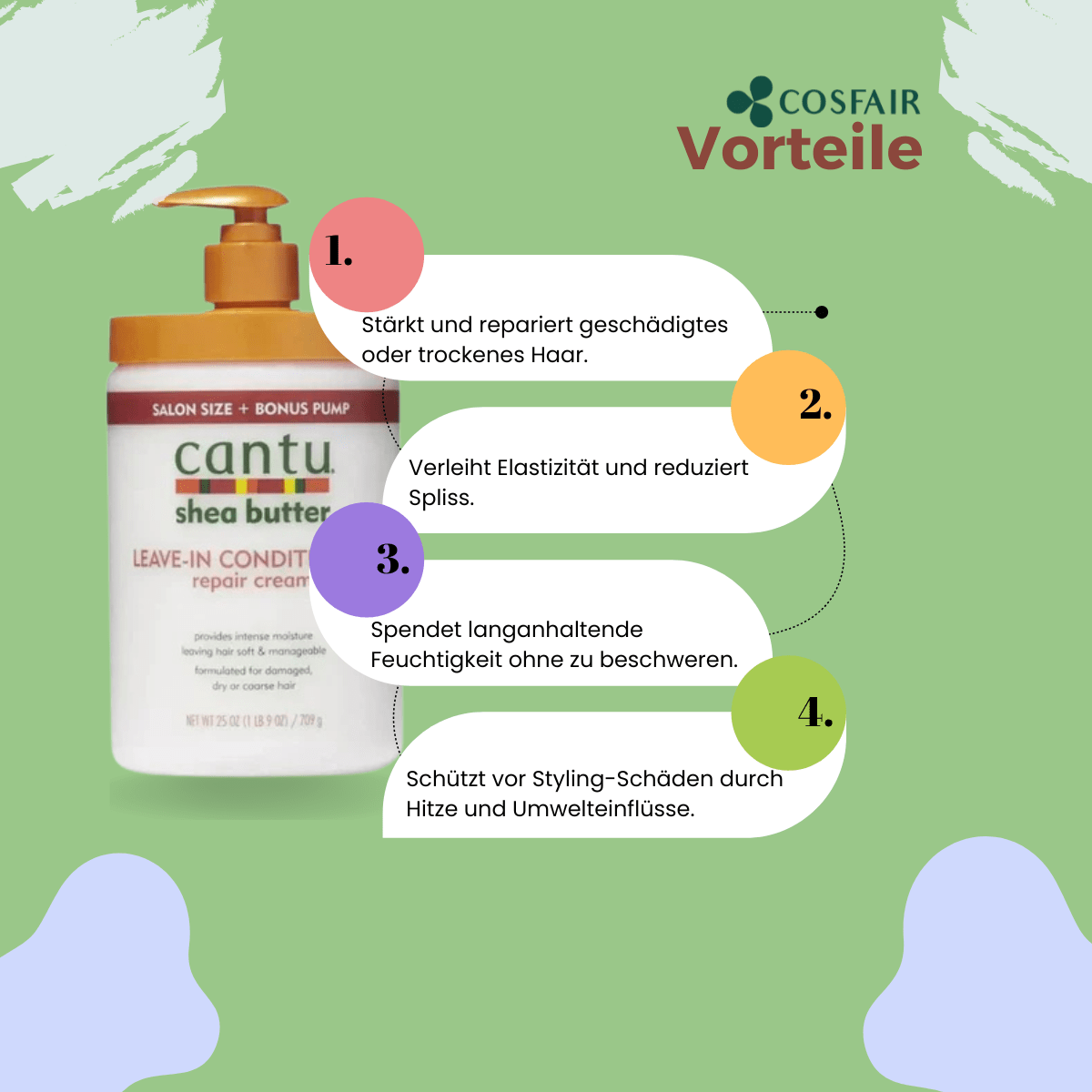 Die Cantu Shea Butter Leave-in Conditioning Repair Cream ist die ultimative Intensivpflege, die selbst stark strapaziertes, trockenes oder chemisch behandeltes Haar wieder geschmeidig, stark und sichtbar gesund macht. Die reichhaltige Mischung aus reiner Shea-Butter, Arganöl und pflegenden Pflanzenextrakten versorgt jede Strähne mit tiefenwirksamer Feuchtigkeit und reduziert Haarbruch schon ab der ersten Anwendung.