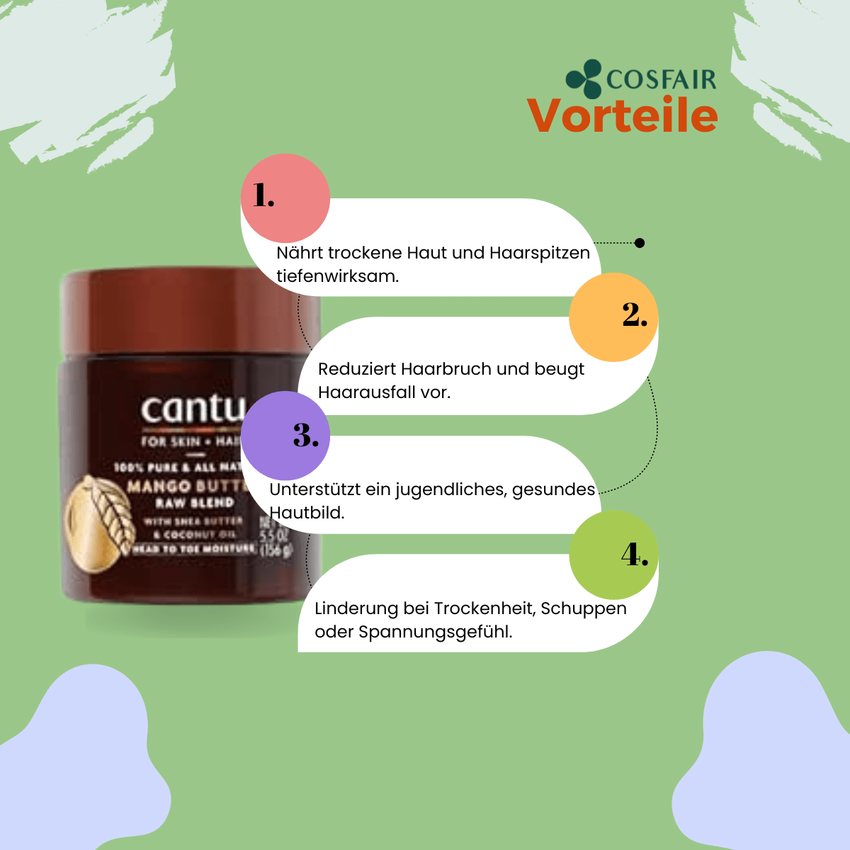 Cantu Skin + Hair Mango Butter Raw Blend provides deep, long-lasting hydration from head to toe. The signature blend is made with just three natural, ultra-moisturizing raw ingredients: 100% pure and certified organic mango butter and 100% pure shea butter and coconut oil. Experience the soothing properties of pure mango butter, which increases skin elasticity and strengthens hair follicles to reduce breakage and hair loss.