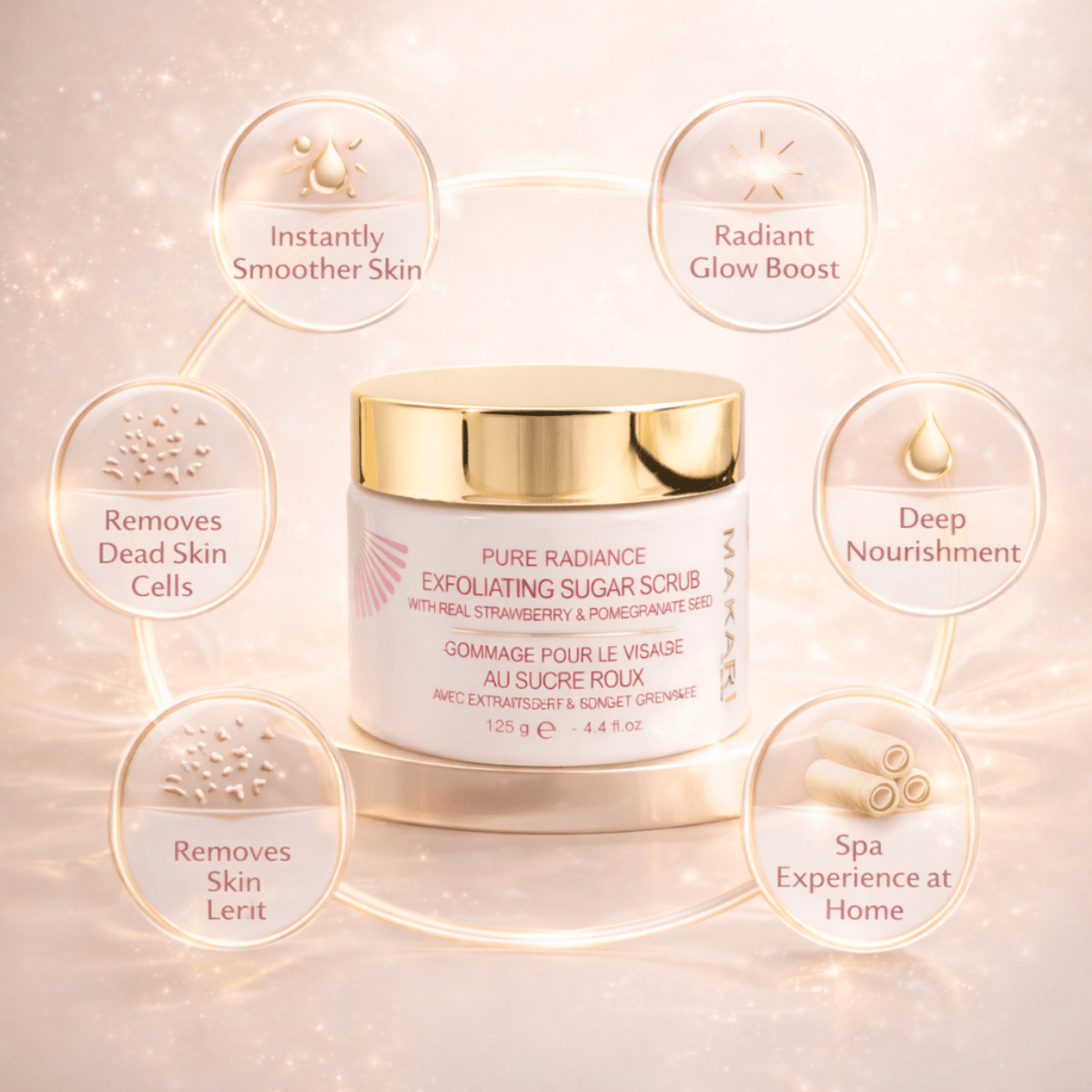 Makari Pure Radiance Exfoliating Sugar Scrub, enriched with strawberry and pomegranate seeds, gently removes dullness, imperfections and rough patches. This nourishing and exfoliating scrub rejuvenates the complexion, leaving skin brighter, softer and smoother. Recommended for all skin types, it instantly improves skin radiance, smoothes skin texture and provides a silky, velvety feel.