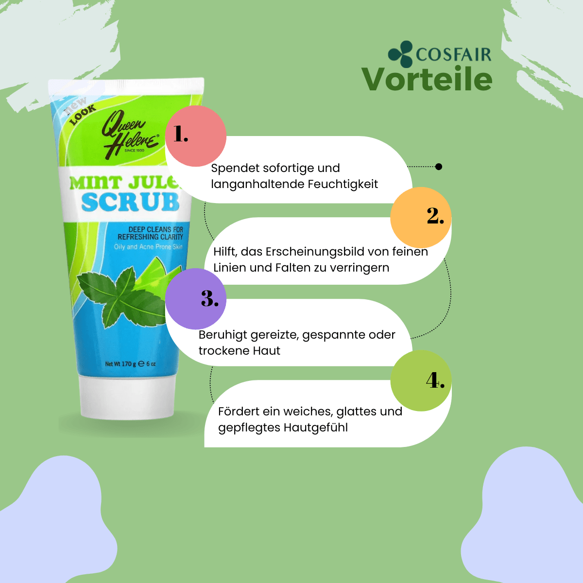 Queen Helene Mint Julep Scrub is a refreshing natural fiber facial scrub that cleanses thoroughly and leaves a tingling mint glow. The gentle exfoliating action removes impurities, clogged pores and dead cells. Emollients replenish moisture and protect against the elements. With Mint Julep Scrub, the skin looks fresh and healthy, feels refreshingly soft and smooth. No animal testing and no animal ingredients.