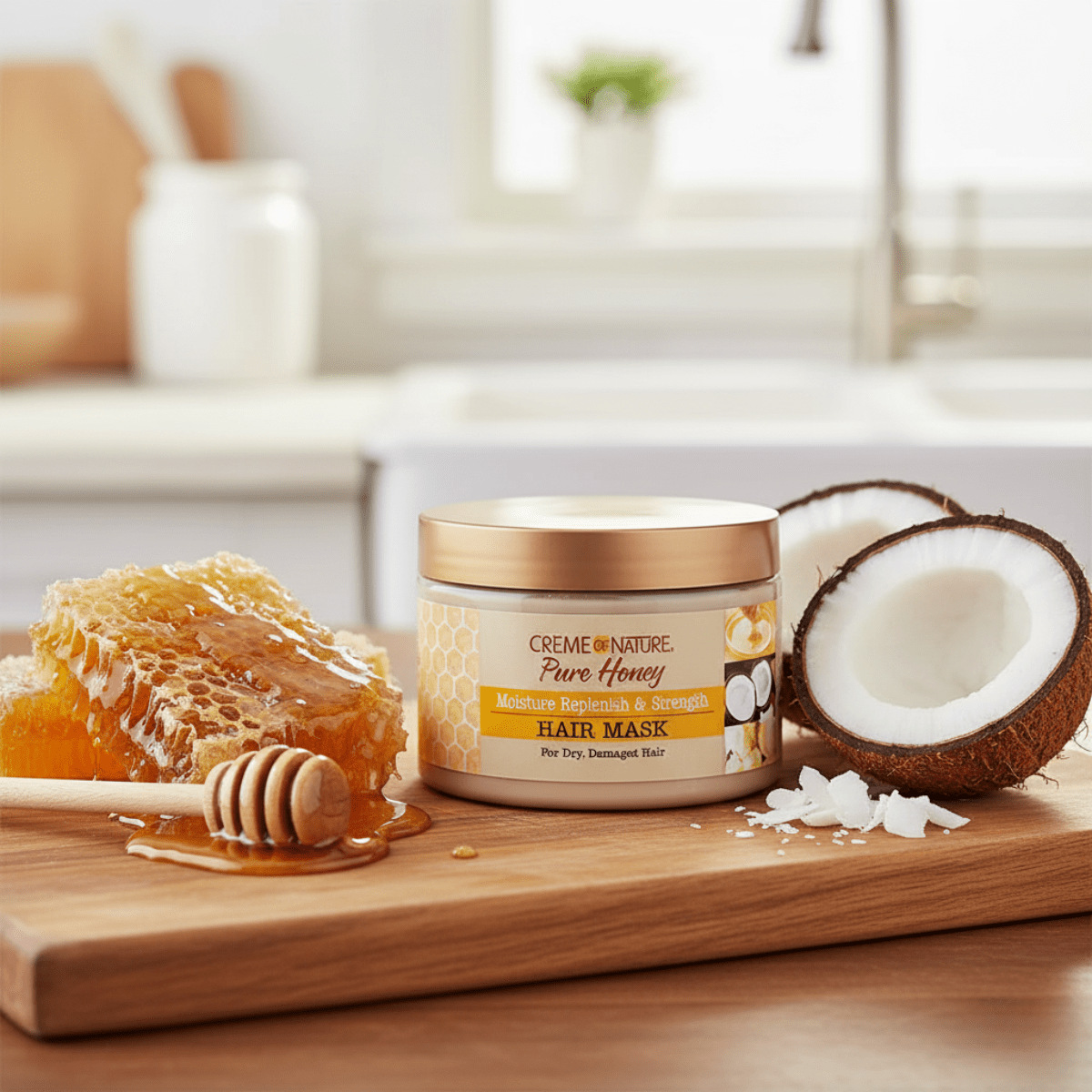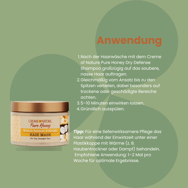 Creme of Nature Pure Honey Moisture Replenish & Strength Hair Mask moisturizes, prevents breakage and provides frizz control for curly hair. Enriched with pure honey, certified natural coconut oil and shea butter, the moisturizing benefits of this mask target dry and dehydrated hair.