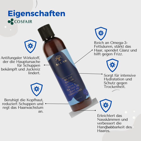 Erlebe sofortige Erleichterung, intensive Feuchtigkeit und langanhaltenden Schutz mit dem As I Am Dry & Itchy Scalp Care Leave-in Conditioner. Entwickelt für empfindliche, trockene und zu Schuppen neigende Kopfhaut, kombiniert dieser Leave-in hochwirksame Inhaltsstoffe wie Piroctone Olamine, Teebaumöl und nährendes Olivenöl, um Deine Kopfhaut zu beruhigen, das Haar zu stärken und Frizz zu reduzieren.