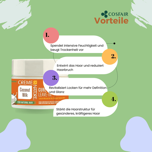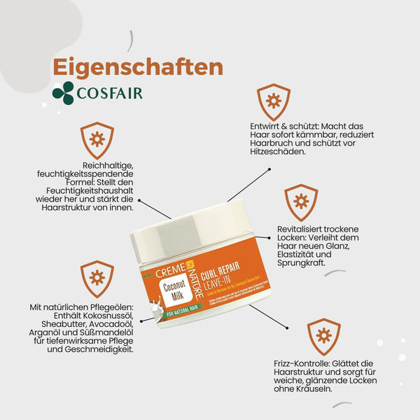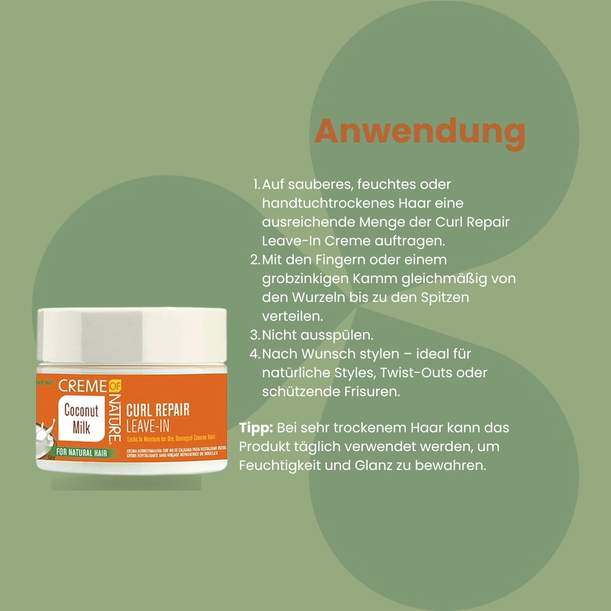 Creme of Nature Coconut Milk Curl Repair Leave-in restores your hair and adds shine. This leave-in conditioning cream is enriched with certified natural coconut oil. Instantly detangles dry, lifeless curls and moisturizes for manageable hair with less frizz. Use daily to moisturize, prevent breakage and promote stronger, healthier hair.
