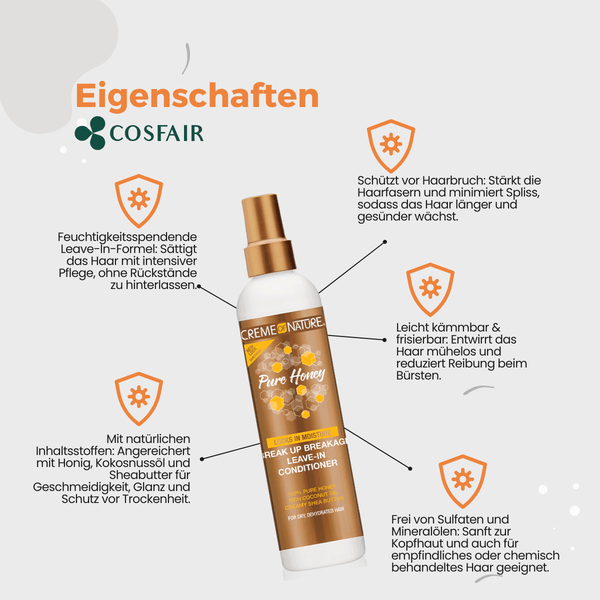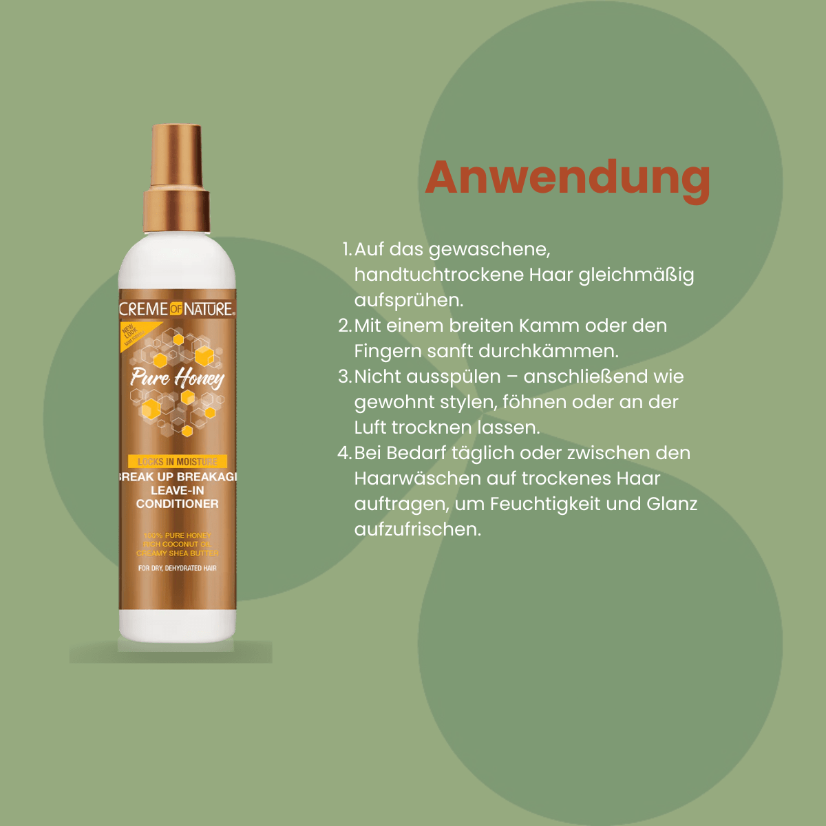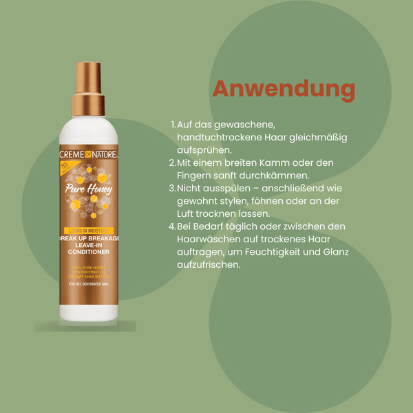 Creme of Nature Pure Honey Breakage Leave-in Conditioner is your solution for dry hair by not only moisturizing but also protecting against breakage. Our special formula will help you detangle your dry hair more easily while maintaining its moisture levels. Trust us and give your hair the care it deserves.