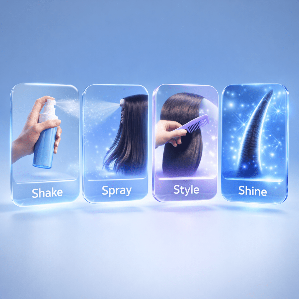4️⃣ Für extra Glanz leicht auf trockenes Haar sprühen.