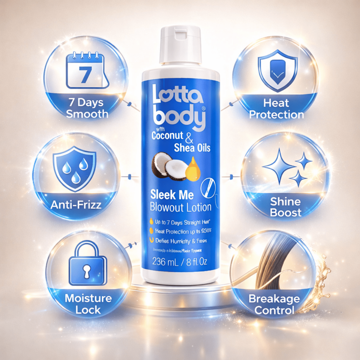Lotta Body Sleek Me Blowout Lotion, enriched with coconut and shea butter oil, penetrates deep into the hair, moisturizing it and leaving it soft, nourished and radiant. This lightweight, non-greasy lotion allows you to effortlessly change your look from naturally curly to silky smooth. Nourishing and protective, it prevents over-drying and hair breakage, combats moisture loss and frizz, and gives your hair a shiny, smooth effect.